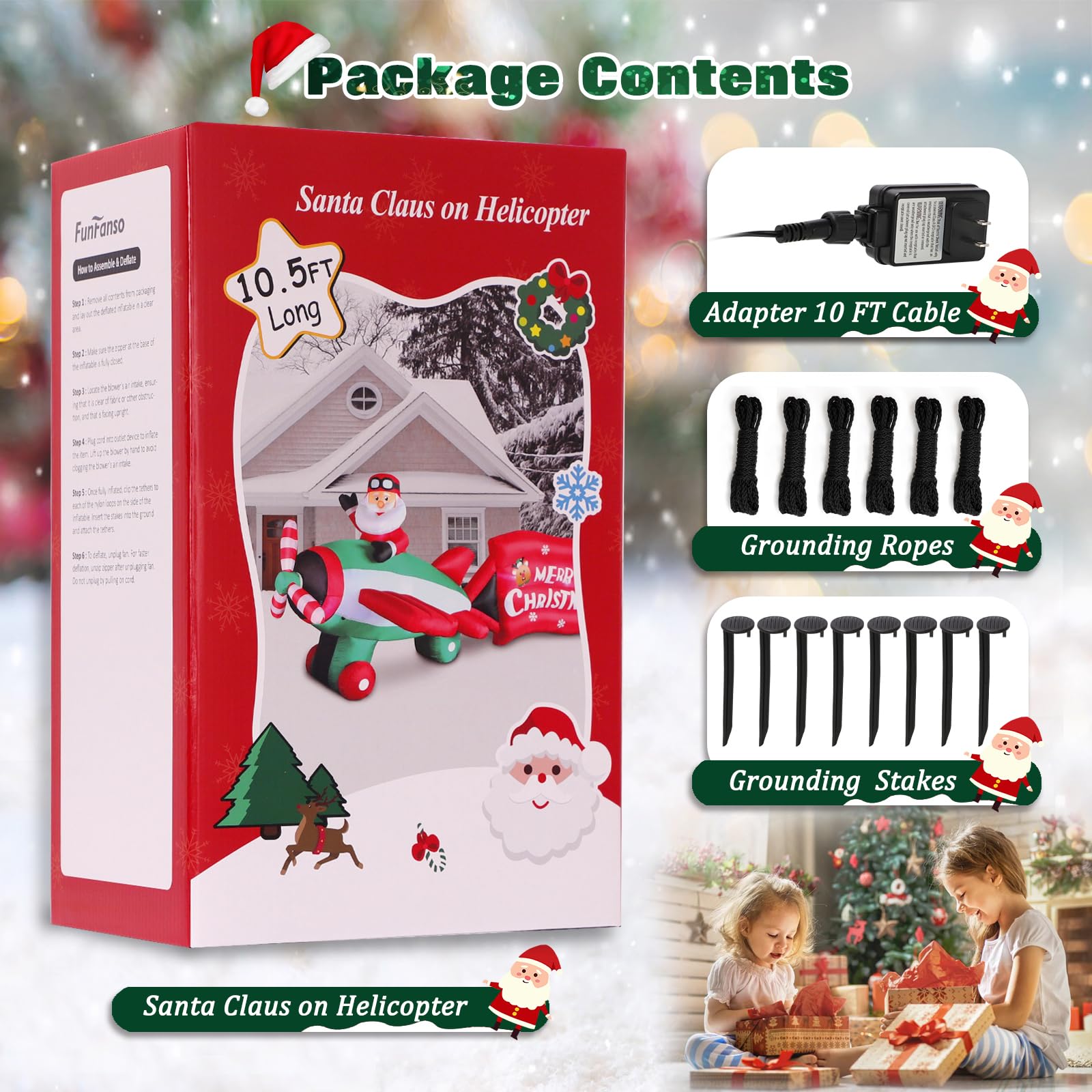 - 🎅【10.5 FT Giant Inflatable Santa Clause Flying Airplane】Christmas inflatables Santa Claus flying airplane with Merry Christmas wishes happily waves to everyone. Inflatable helicopters have rotating propellers for added interactivity! In addition, the built-in bright white LED lights will light up your lawn or garden in the evening. Santa claus airplane inflatable always bring your families endless surprises and joy, creating a warm Christmas atmosphere!