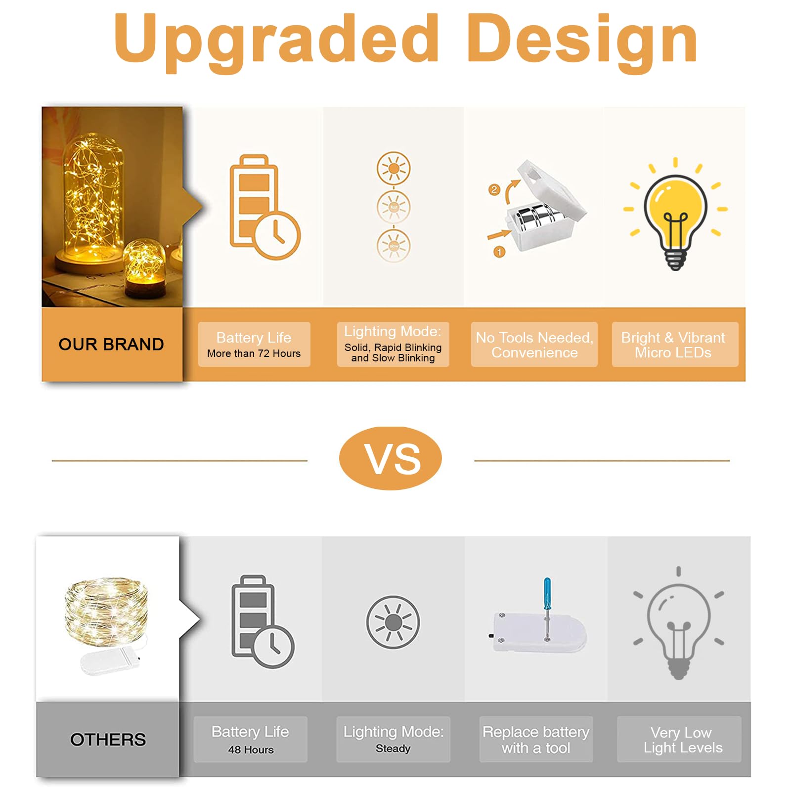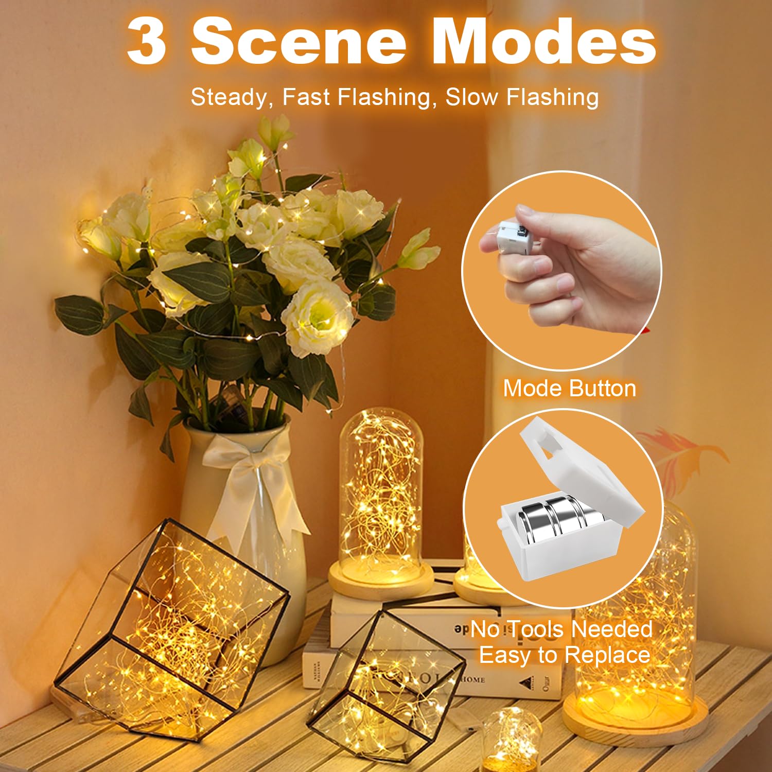 - ✔Button Controlled & 3-Mode Fairy Lights: This 10 pack of 20 bright leds fairy lights battery operated are battery-powered and have a 7-foot flexible wire for versatile decoration. A simple button on the battery box lets you switch between on/off three light modes: steady, rapid blinking or slow blinking to match your desired lighting effect