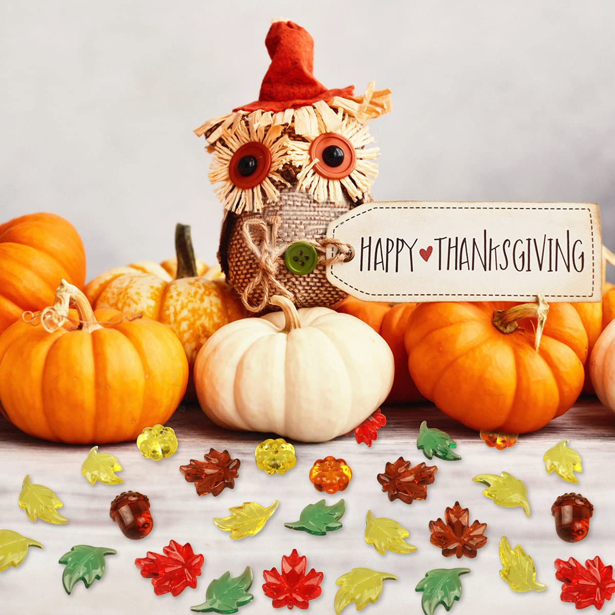 - PACKAGE INCLUDES: You will get 6 colors 100 pieces mini acrylic gems fall decor.Total of 10 pumpkins,10 acorns, 30 maple leaves, 50 leaves.Each with a realistic appearance and bright colors.Great for you to autumn and Thanksgiving decoration.