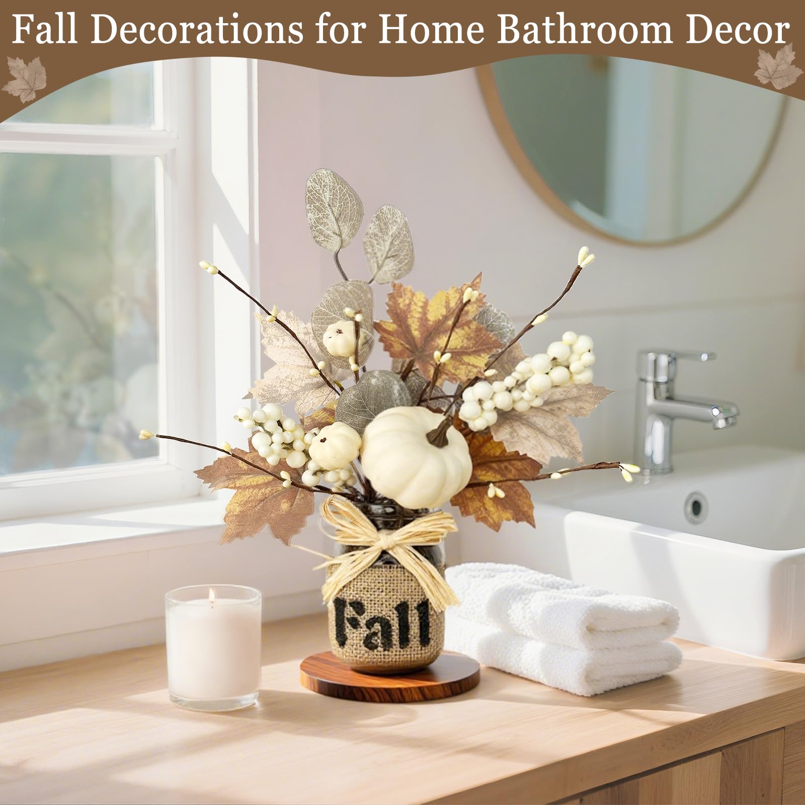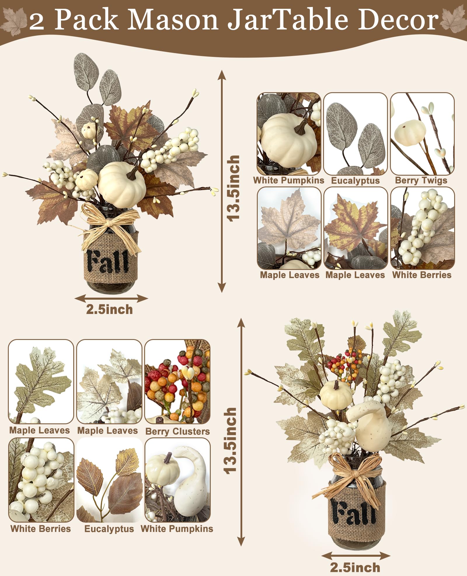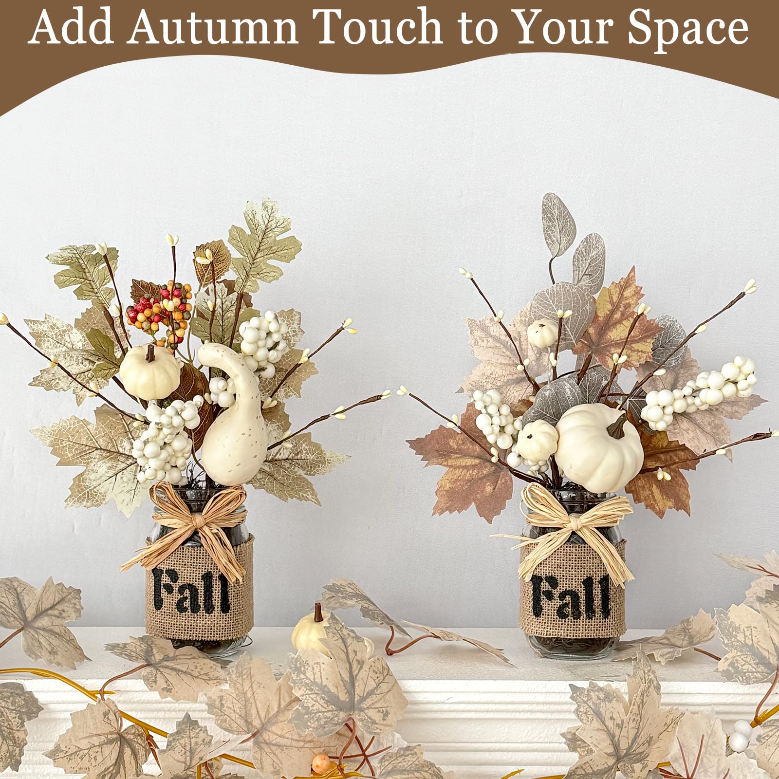 - Fall Table Decor: 2 pack of rustic fall table centerpieces features white pumpkins, frosted maple leafed, eucalyptus, and berried clusters in a 5' mason jar wrapped in burlap with a 'Fall' print—an elegant twist on traditional fall decor