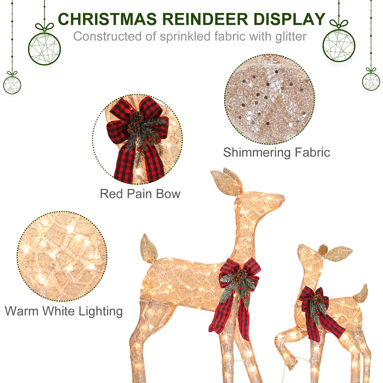 Details: This golden glittering set Doe and Fawn comes with beautiful red, buffalo plaid bows to dress them up in your yard just a little more. It turns your yard into a winter wonderland and light-up the outdoors for the holidays.This pre-lit reindeer set come with 105 incandescent clear warm white lights in total. (Doe 70 lights / Fawn 35 lights). The dimension of the Doe is 32'' L x 12'' W x 40'' H, Fawn is 20'' L x 12'' W x 28'' H. The outdoor deer Christmas decorations includes metal stakes and zip ties to secure display in a front or side yard. UL certified safer and more environmentally friendly than other forms of power supply. This Reindeer set is constructed of a sparkle waterproof mesh fabric that is wrapped around a sturdy wire frame. Weather-resistant fabric material endure season after season. Displayed in indoor or covered outdoor location. The realistic appearance with mellow and bright light enables the reindeer to be a gorgeous festive decoration. With this reindeer around, you can feel a deeper festival atmosphere and spend delightful time with friends and family.
