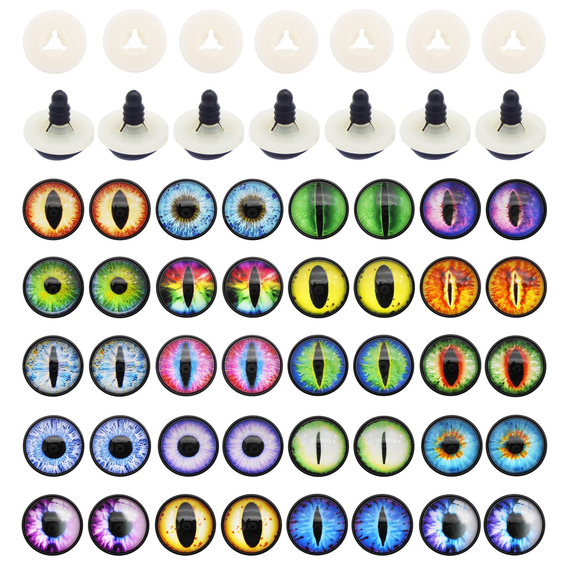 Material: glass dragon eye with plastic eyes holder and plastic washer. Size of the eye is 24 mm about 0.94 inches Package includes 20 pairs safety dragon eyes and 40pcs matching safety eye washers