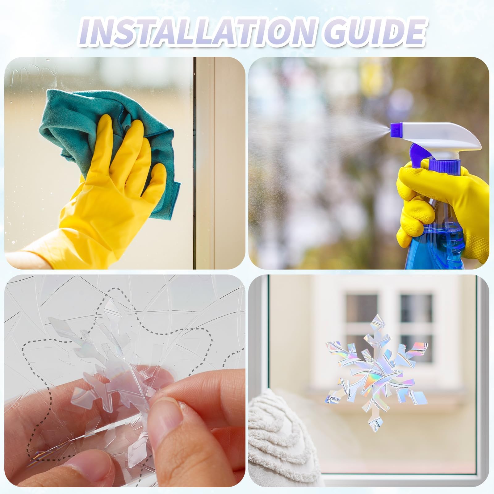 Hassle-Free Application: These iridescent snowflake window clings are crafted from high-quality static PVC material, allowing them to adhere securely without any glue or adhesive. Simply spray a bit of water on the window surface for a secure hold, and remove them easily without residue or surface damage. This makes them an ideal reusable decoration for multiple events and seasons.