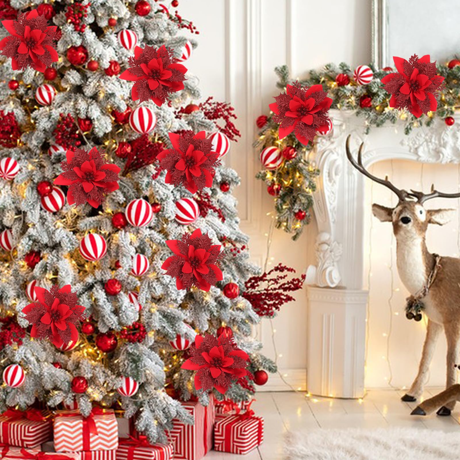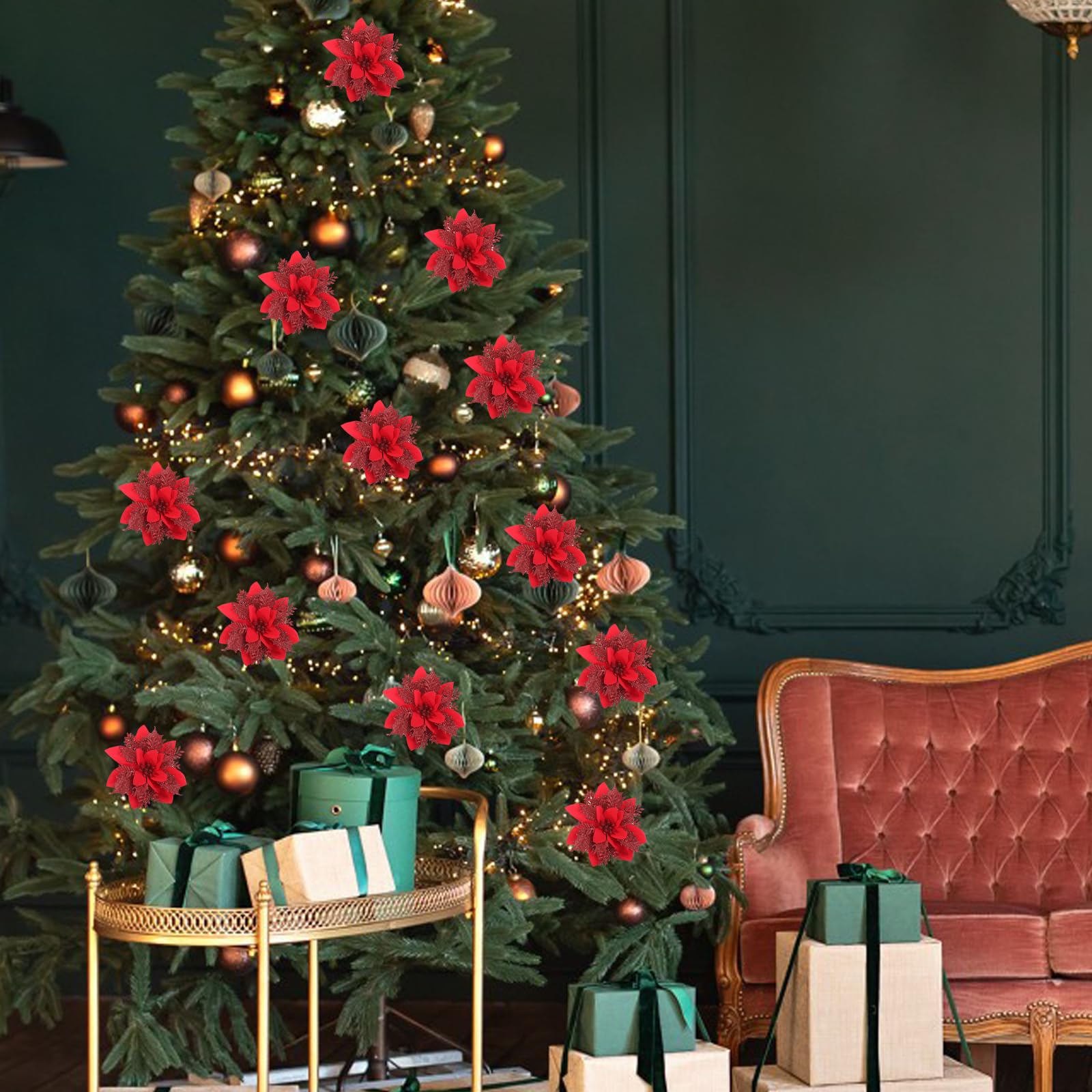- 24 Pcs Glitter Poinsettia Flowers:The christmas poinsettia decorations include 15 Red Christmas glitter poinsettia flowers.Get christmas tree theme ready for glitters galore Poinsettia Flowers