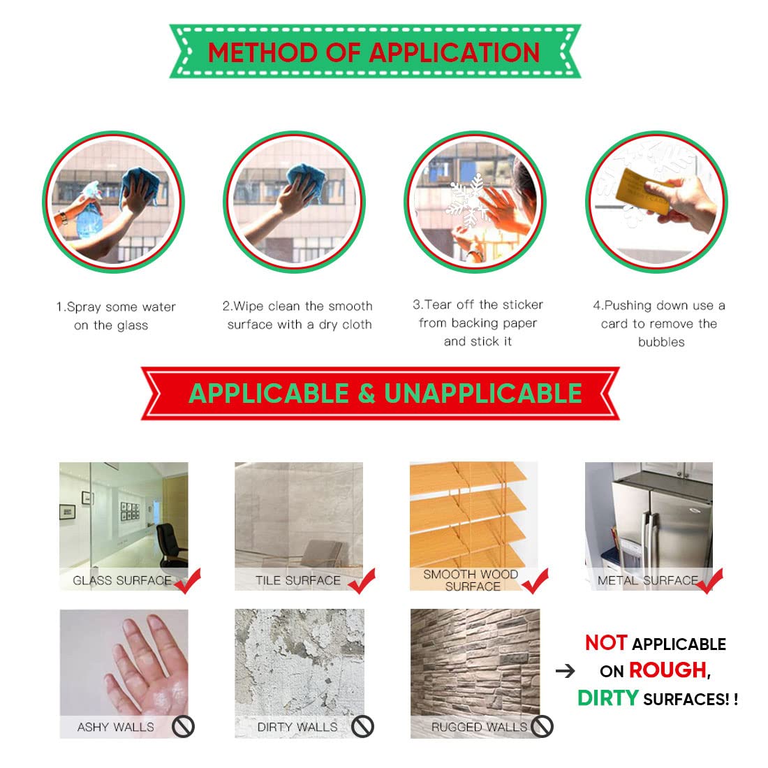 - CHRISTMAS WINDOW STICKERS HAVE WIDE APPLICATION:Christmas window decorations are perfect for Christmas Parties and birthday parties. It can be used in home, school, office, and can be stuck to windows, mirrors etc. Xmas clings for glass windows can create a strong Christmas party atmosphere
