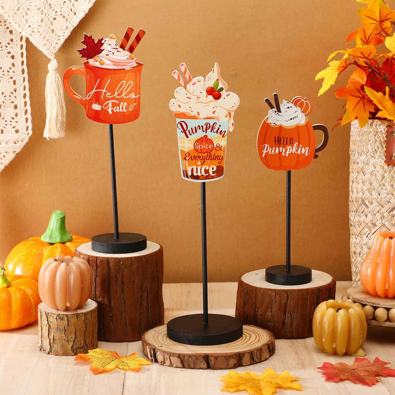 3 Pcs Fall Wood Table Decor Fall Coffee Bar Decor Pumpkin Mug Maple Leaf Wooden Sign Thanksgiving Table Centerpieces for Autumn Thanksgiving Decorations Indoor Outdoor