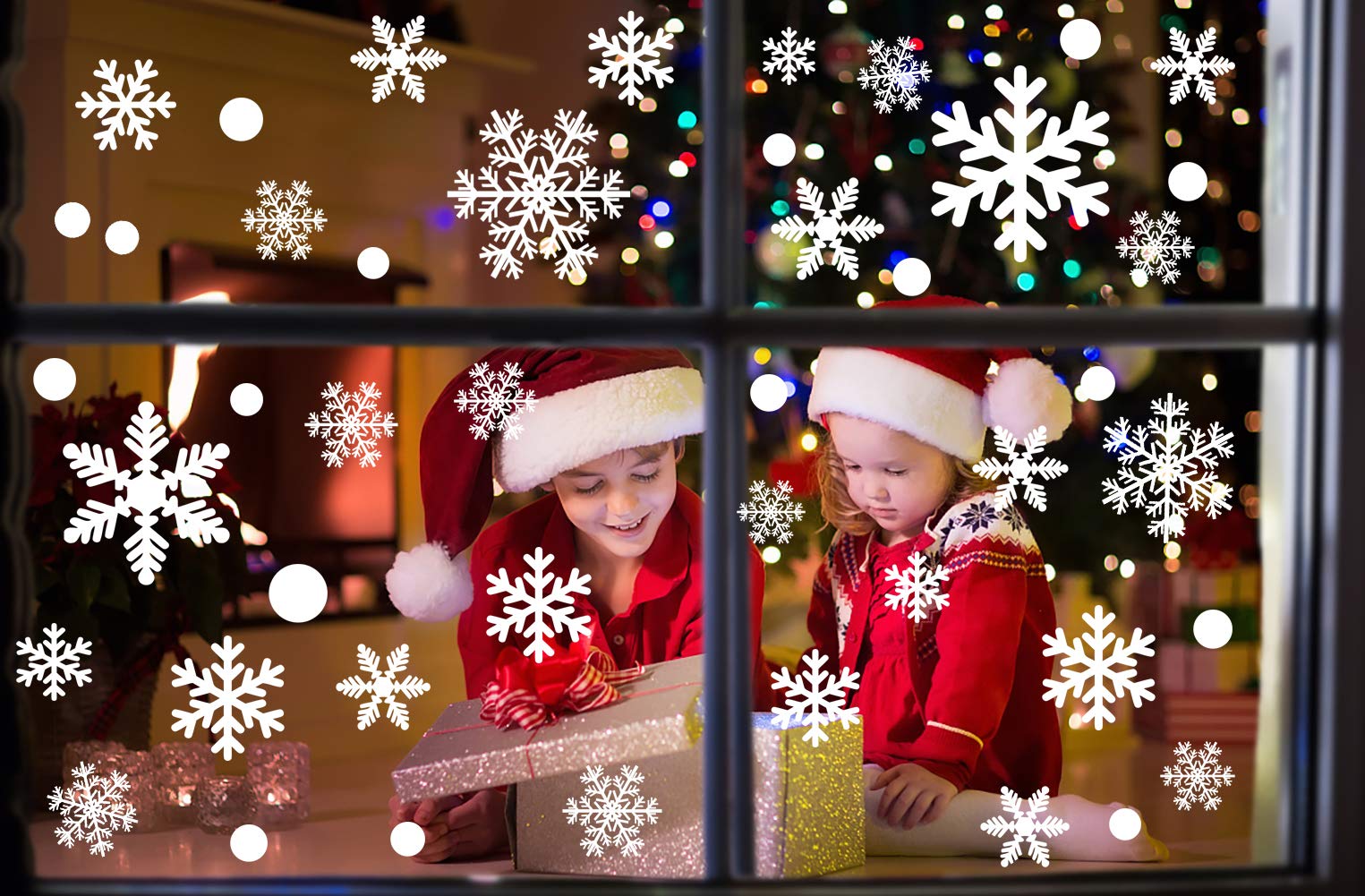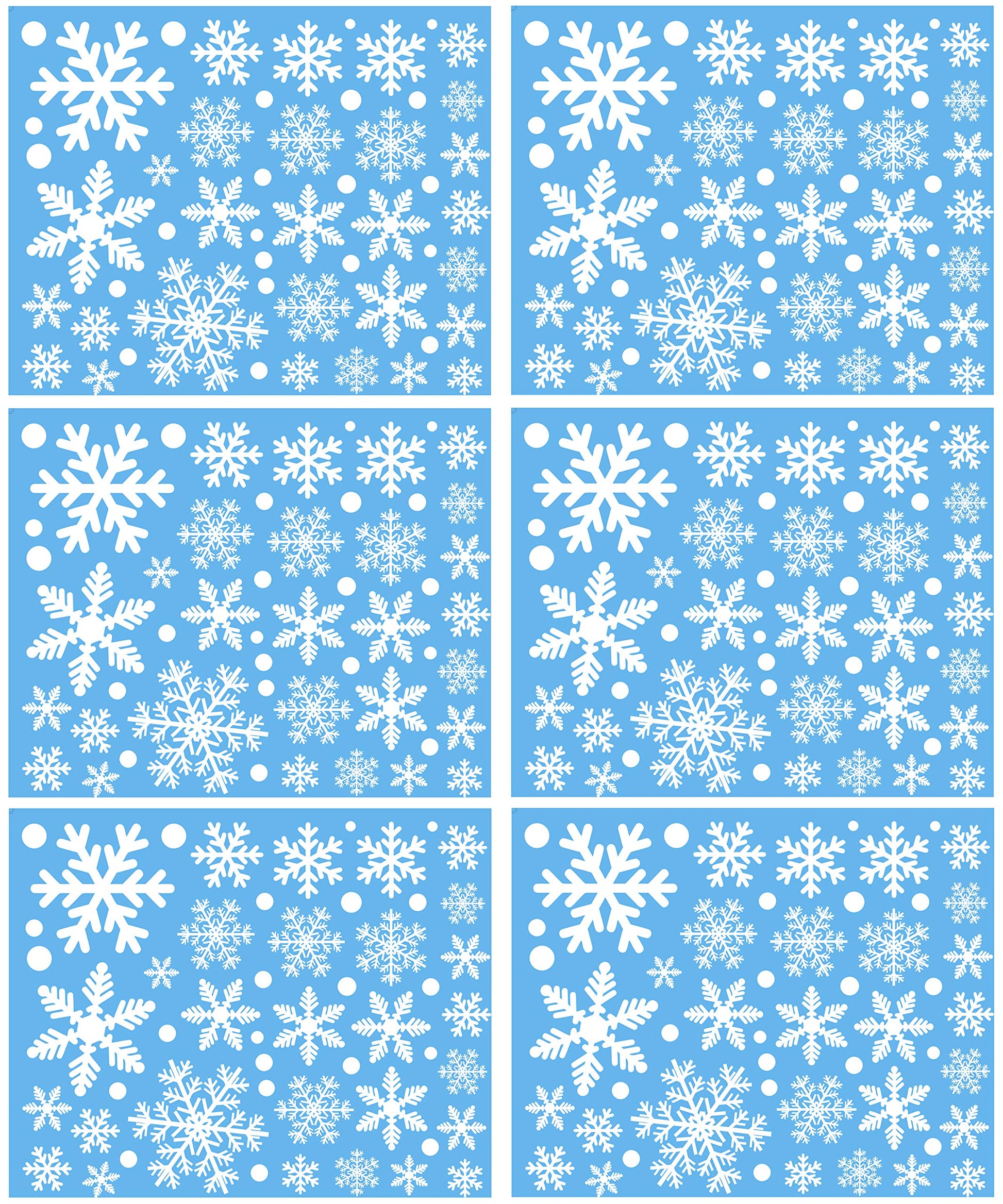- Christmas Snowflakes Decorations Kit Includes:306 pcs in total 174 Snowflakes (in 3 designs)+ 132pcs Dots . 6 sheets Christmas window snowflakes, each sheet measures 14.56inch x 11.8inch.These Christmas snowflake window decorations look really stunning and don't hesitate to buy them for your Christmas party decorations, winter wonderland party supplies.