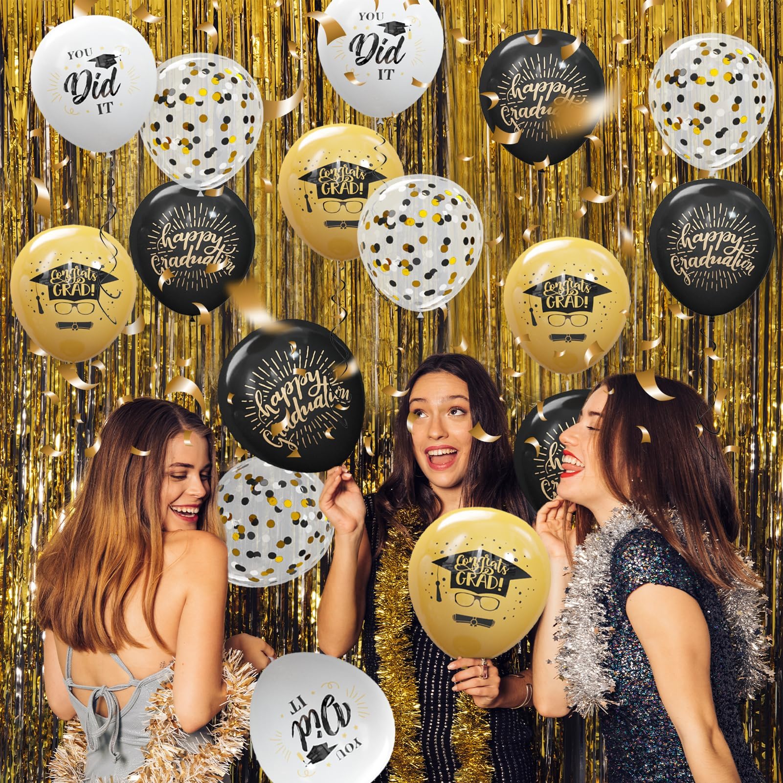 - Graduation Balloons: Our 13 inches Graduation party balloon kit including black, gold, white and black gold confetti balloons, and ribbons, featuring the words of “Happy Graduation”, “You Did IT”, and “ Congrats GRAD”.
