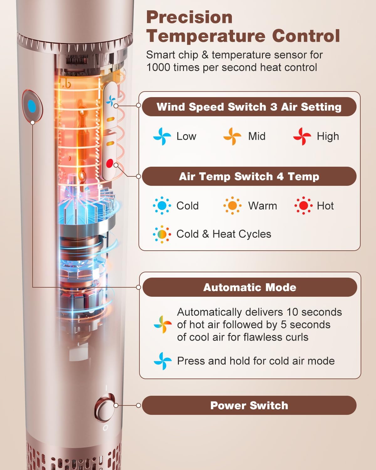 - Safety and User Experience: Featuring ergonomically designed buttons, the blow dryer weighs only 1 pound, allowing for easy one-handed operation and mode switching. The 360° rotating power cord ensures convenient use. Equipped with an NTC feedback system, a bimetallic thermal switch, and a non-resettable fuse, air styler also includes an ALCI safety plug with overheating protection and electric shock prevention.