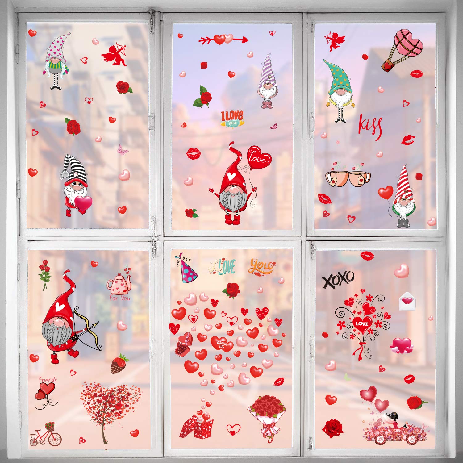 9 Sheets Valentine's Day Window Decals Clings Decorations, 149pcs Gnome Heart Window Stickers for Valentines Day, Glass Windows, Party, Wedding, Anniversary Ornaments Supplies