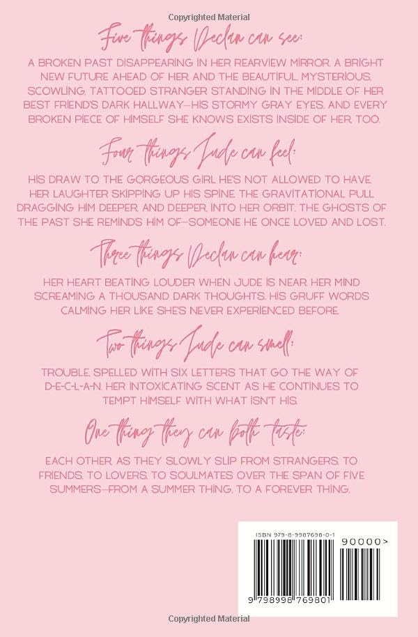 Details: Five things Declan can see: A broken past disappearing in her rearview mirror. A bright new future ahead of her. And the beautiful, mysterious, scowling, tattooed stranger standing in the middle of her best friend’s dark hallway—his stormy gray eyes, and every broken piece of himself she knows exists inside of her, too. Four things Jude can feel: His draw to the gorgeous girl he’s not allowed to have. Her laughter skipping up his spine. The gravitational pull dragging him deeper, and deeper, into her orbit. The ghosts of the past she reminds him of—someone he once loved and lost. Three things Declan can hear: Her heart beating louder when Jude is near. Her mind screaming a thousand dark thoughts. His gruff words calming her like she’s never experienced before. Two things Jude can smell: Trouble, spelled with six letters that go the way of D-e-c-l-a-n. Her intoxicating scent as he continues to tempt himself with what isn’t his. One thing they can both taste: Each other, as they slowly slip from strangers, to friends, to lovers, to soulmates over the span of five summers—from a summer thing, to a forever thing.