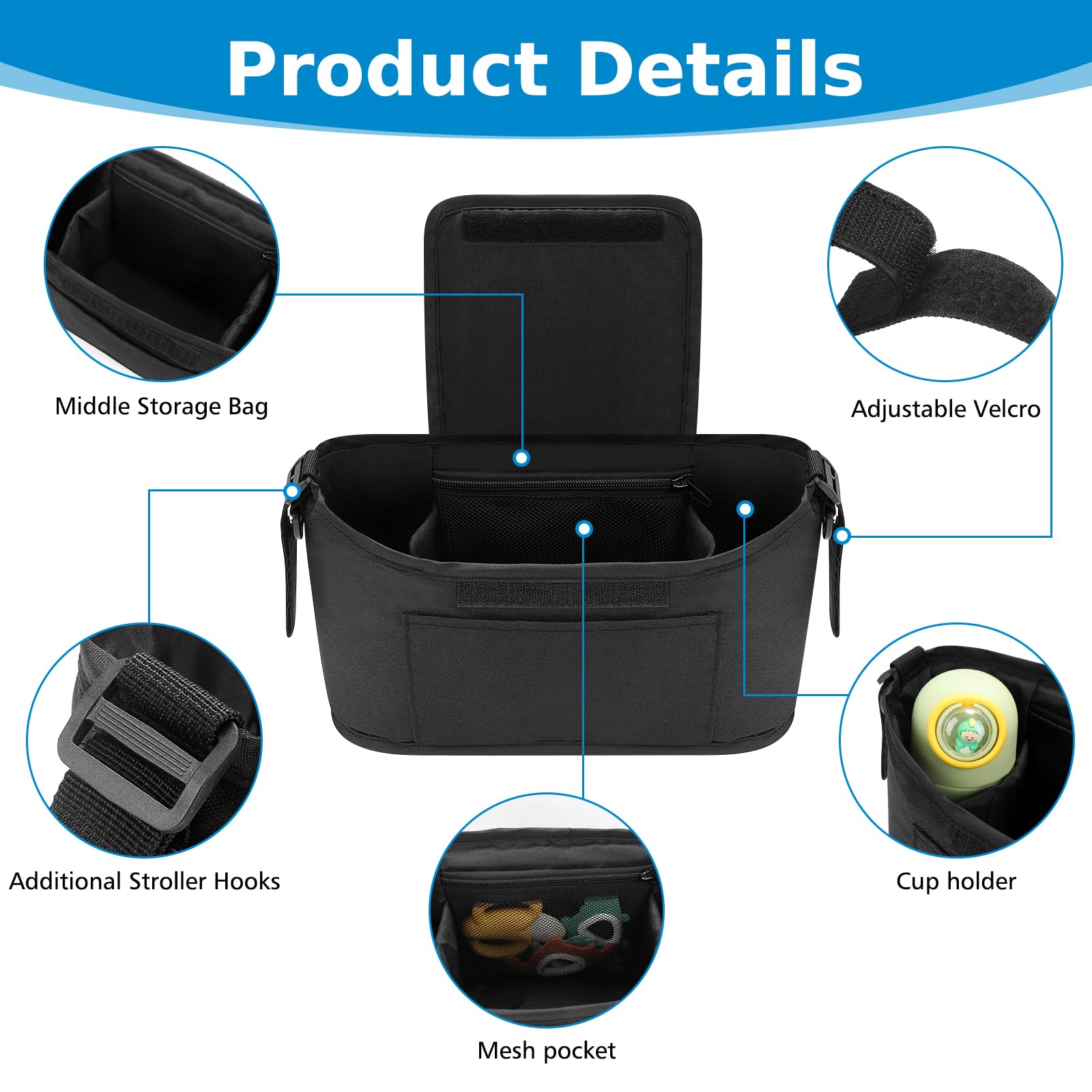- Multi structured Stroller Hanging Bag: This stroller bag has one cup holder each side; one net pocket with zipper; a large storage compartment in the middle. And one convenient phone pocket on the front.