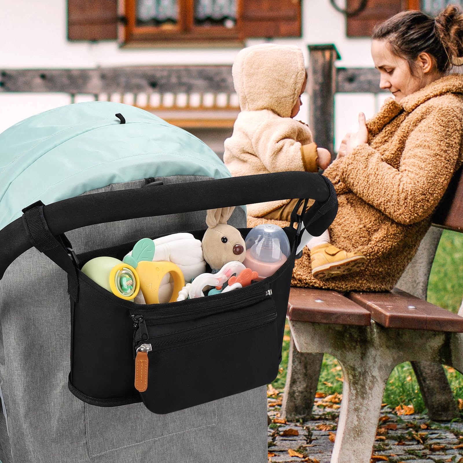 - Large Capacity : The middle large storage compartment can storage baby diapers, toys, clothes, pacifiers or other accessories; 2 cup holders on two sides, can be used to place baby bottles, beverage cups, water bottles etc; Zipper pocket can hold important items such as cell phone.