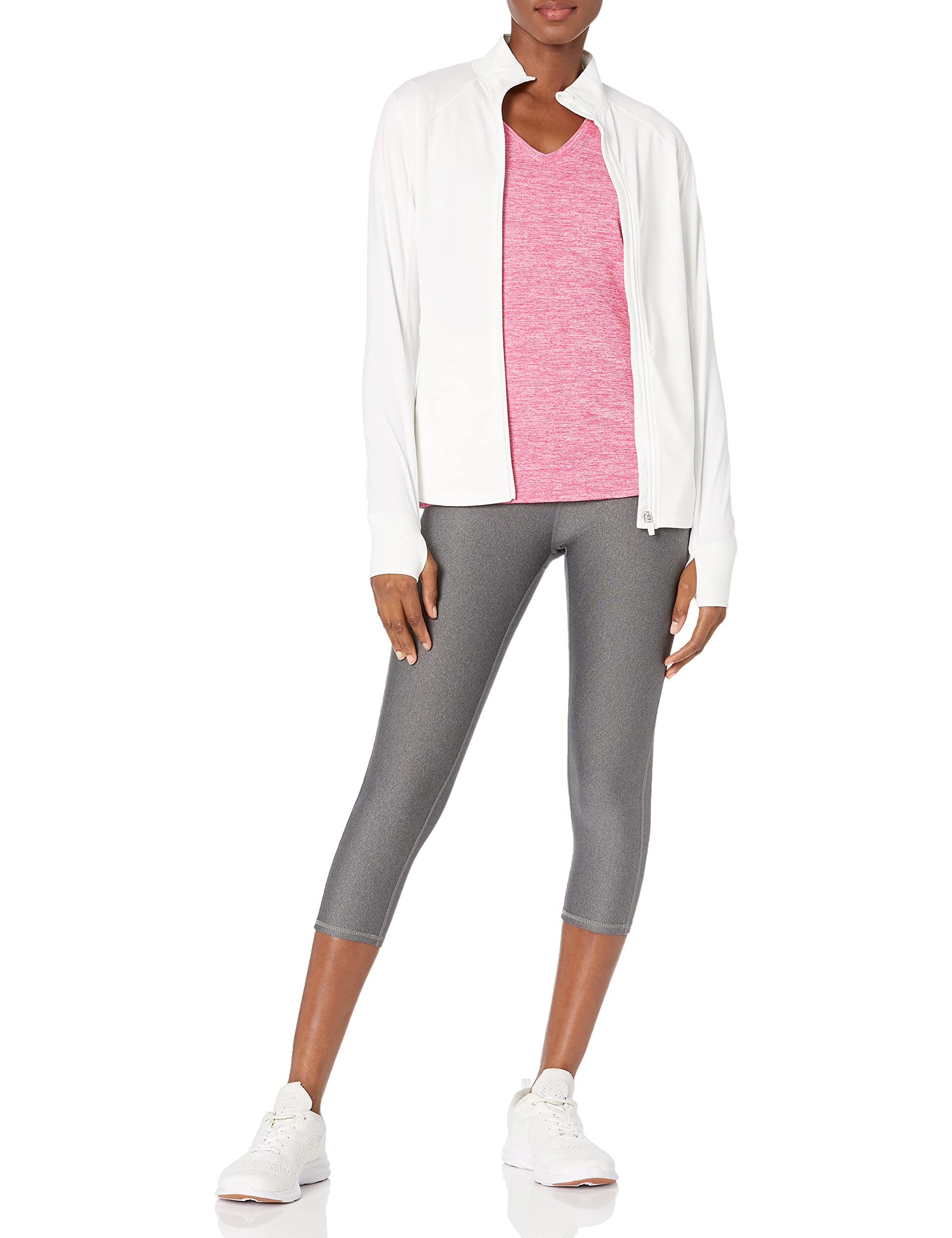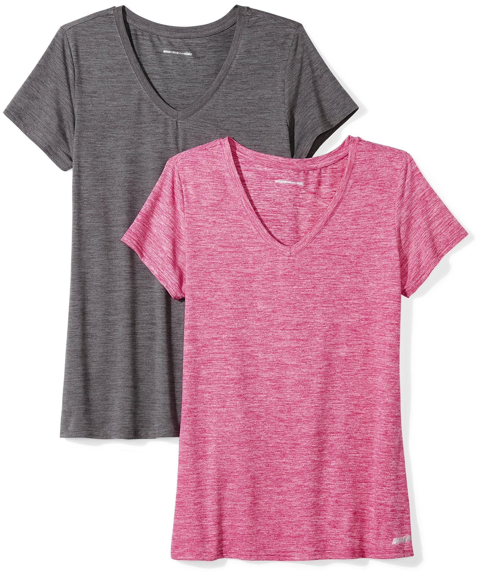 Amazon Essentials Women's Active Quick Dry Tech Stretch Short-Sleeve V-Neck T-Shirt (Available in Plus Size), Pack of 2, Charcoal Heather Space Dye/Raspberry Red Space Dye, Small