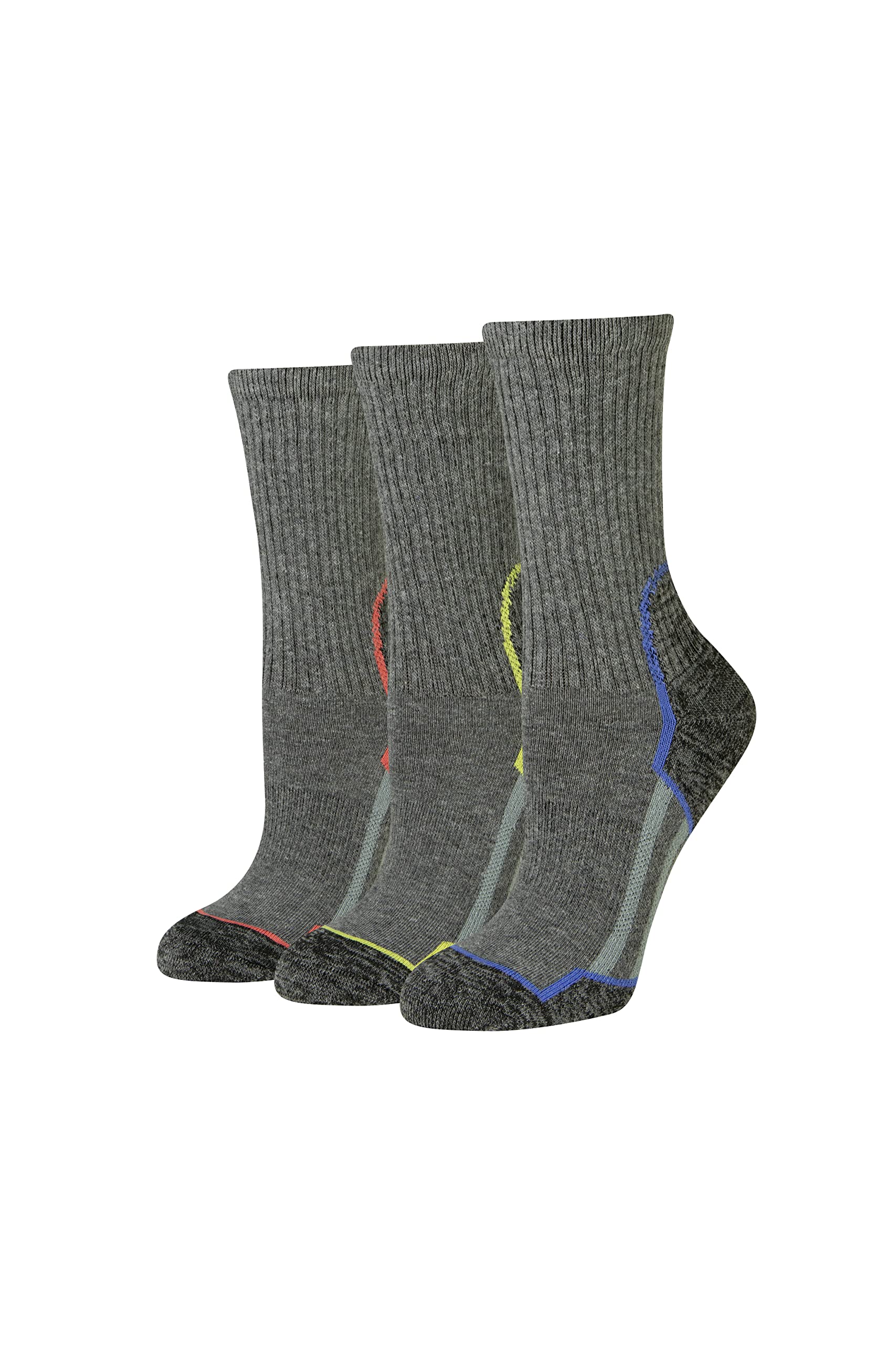 These cushion cotton hiking crew socks come in a pack of three pairs with arch support, comfort toe seam and reinforced heel and toe for long lasting durability