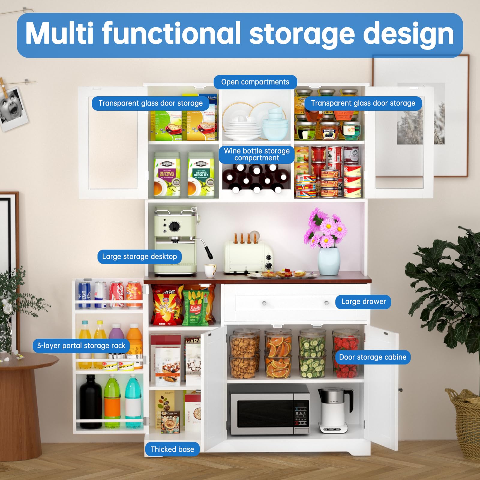 - Multi functional storage design: This pantry cabinet is a great helper for organizing the kitchen. The spacious desktop, large drawers, and combination of open and closed storage make it perfect for storing food, cookware, or cutlery. Whether used as a kitchen pantry storage cabinet, food pantry cabinet,or even a buffet cabinet,its multifunctional design adapts to any kitchen or dining room.