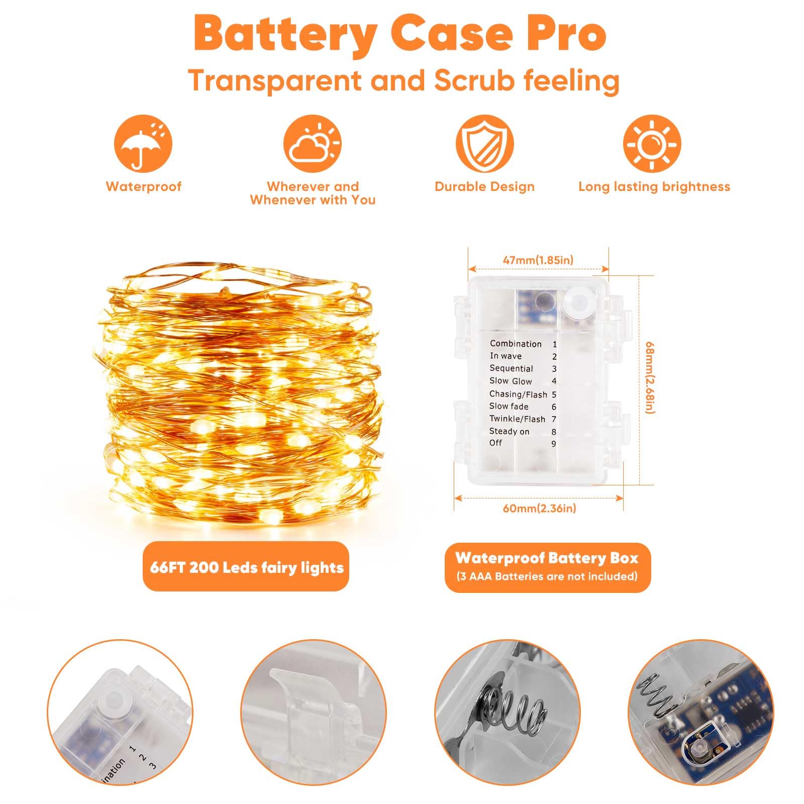 - Weatherproof Design: IP44 rated waterproof battery box and rubber-sealed string lights endure any weather, making them perfect for outdoor decoration.