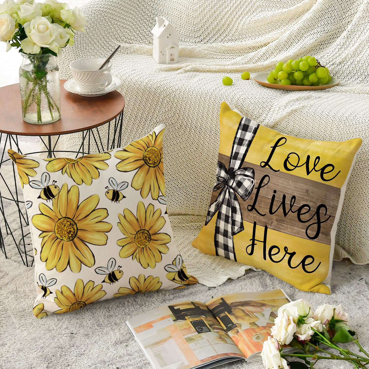 AVOIN colorlife Home Sweet Home Bee Sunflower Throw Pillow Covers, 18 x 18 Inch Love Lives Here Spring Summer Stripes Cushion Case for Sofa Couch Set of 4