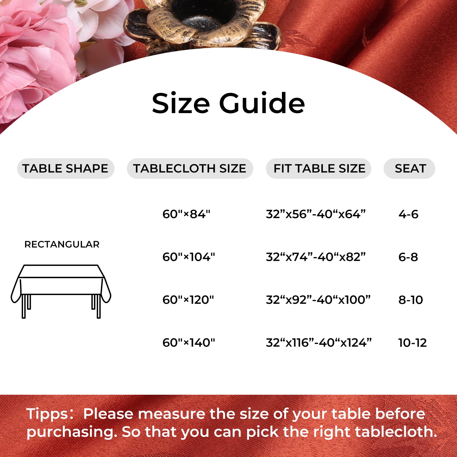 - Size Measurements: This rectangular table cloths are available in 4 sizes: 60'×84' (4-6 Seats), 60'x104' (6-8 Seats), 60'x120' (8-10 Seats), 60'x140' (10-12 Seats), please measure your table size and according to the size guiding chart before purchasing