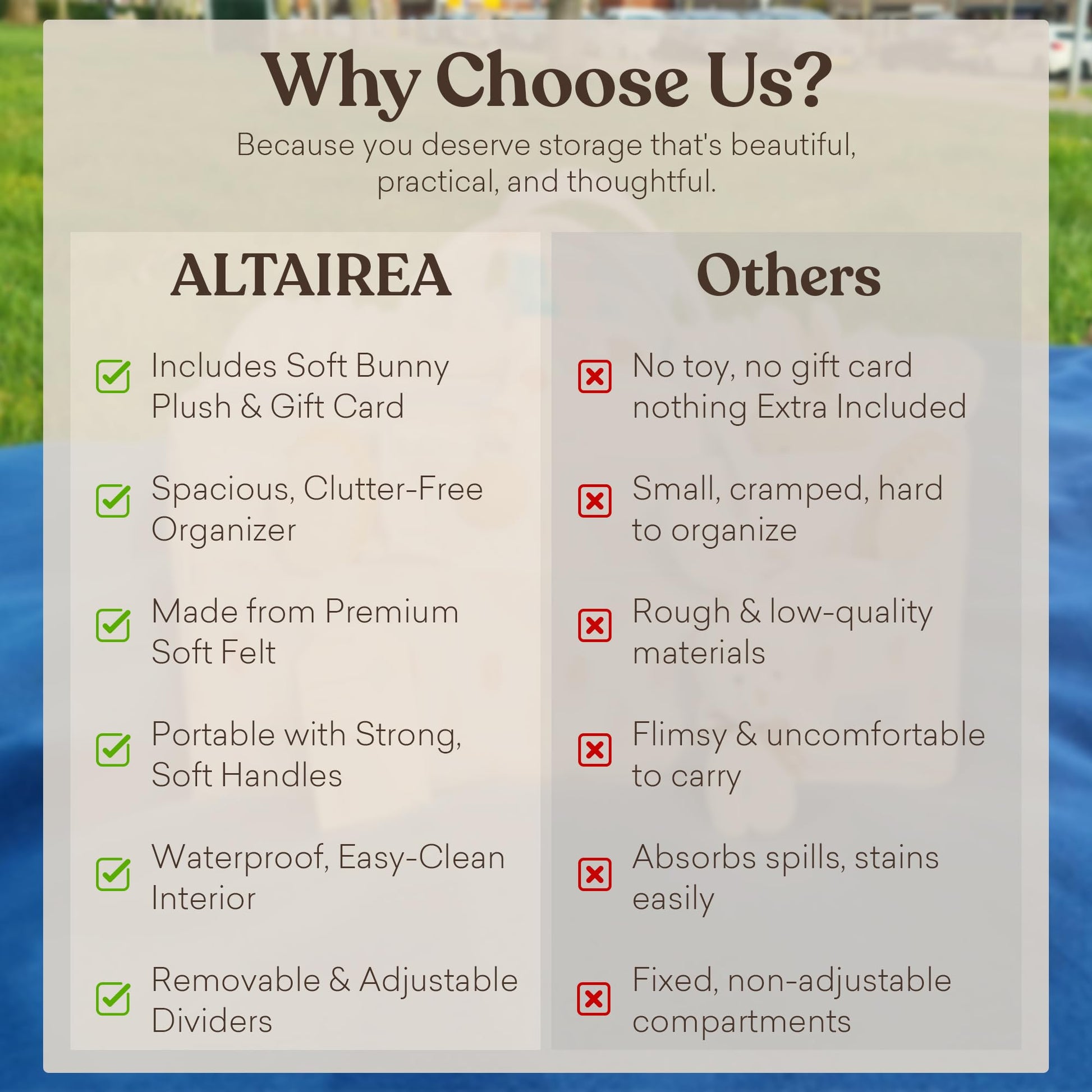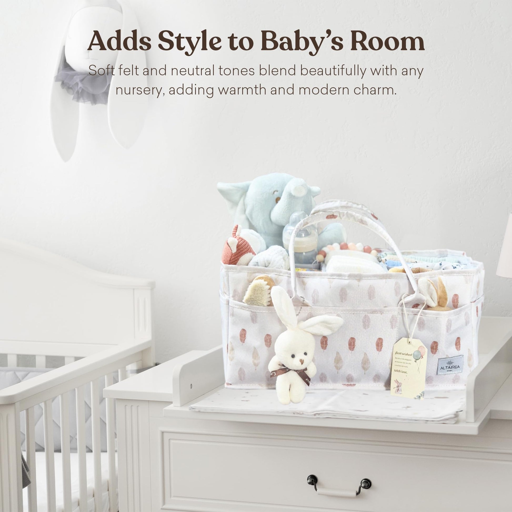 - Spacious felt diaper caddy organizer with strong handle and removable dividers for stackers, wipes, breast pump, diapers, toys, or nursery essentials; with plush toy and gift card included