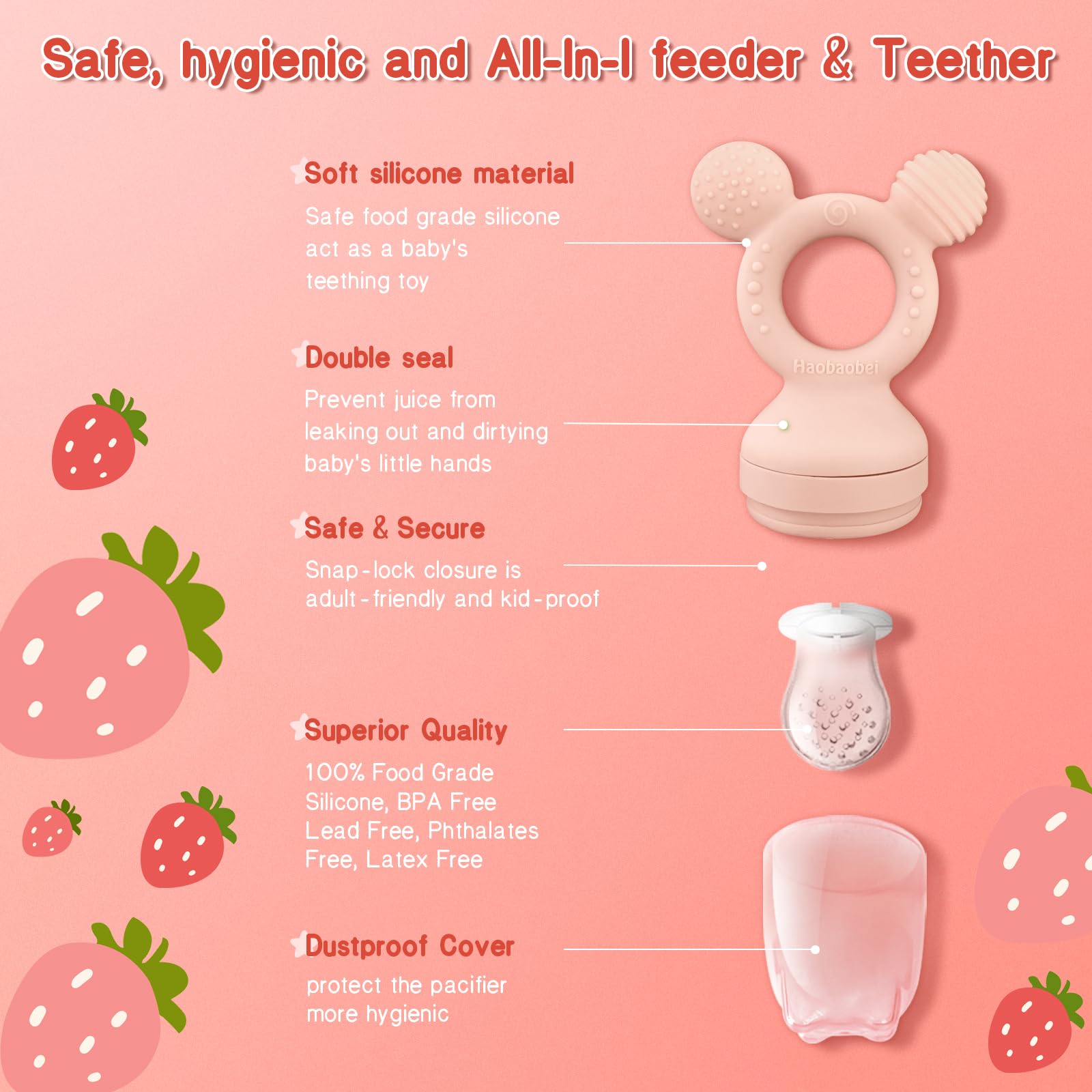 - [Versatile Functionality] Featuring soft yet durable silicone handles, our feeder/teether combo serves multiple roles. Use it as a feeder for fruits, baby food, or breast milk, then flip it over to transform the handle into a soothing teething toy, providing relief for your baby's teething discomfort.
