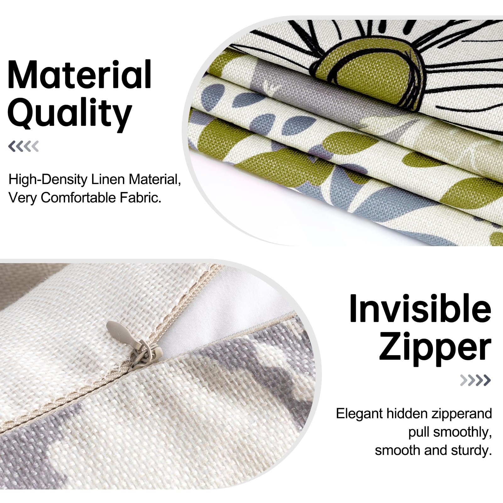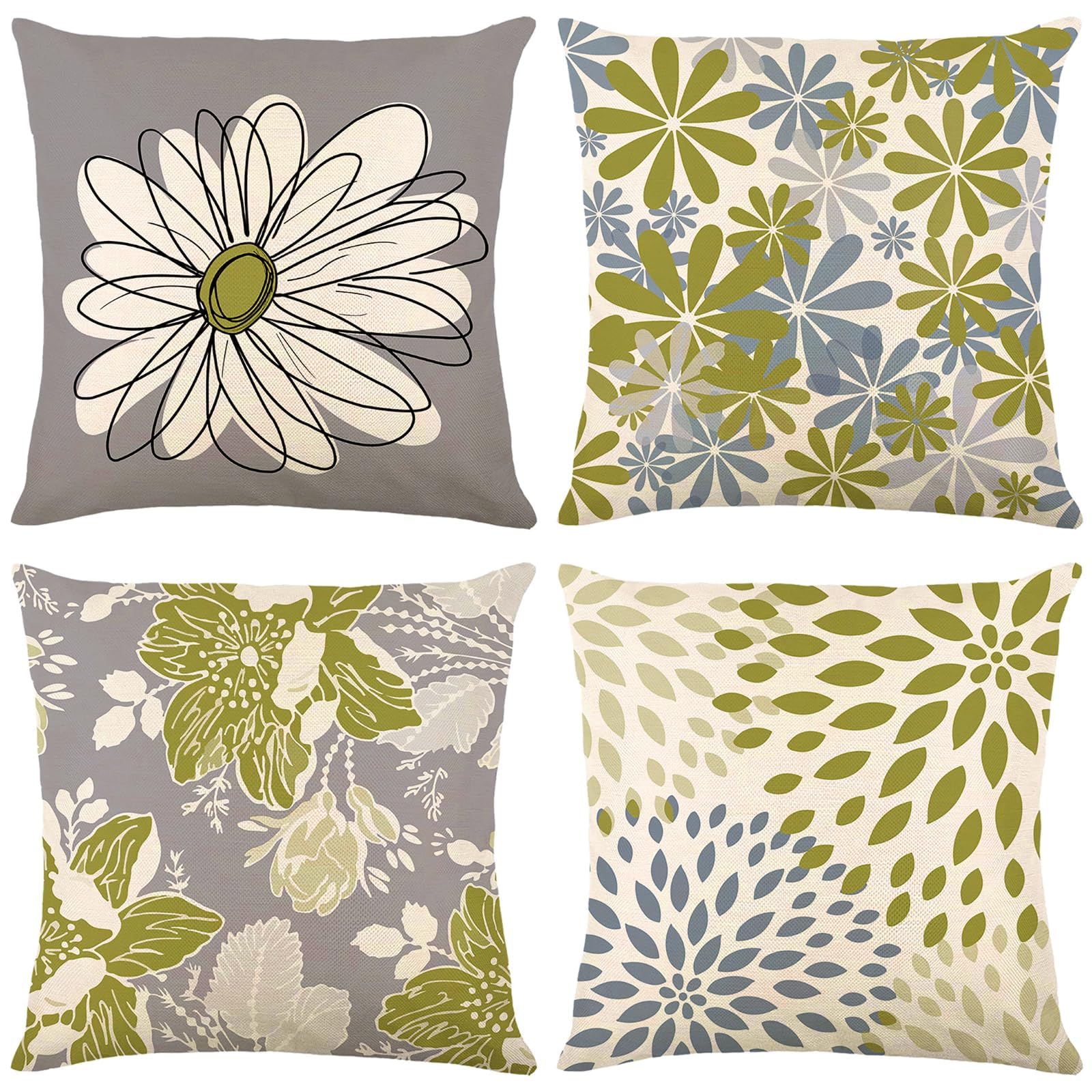 Baidast Green Olive Decorative Throw Pillow Covers 18x18 Set of 4, Green and Grey Modern Daisy Floral Pillows Linen Pillow Covers for Couch Sofa Living Room