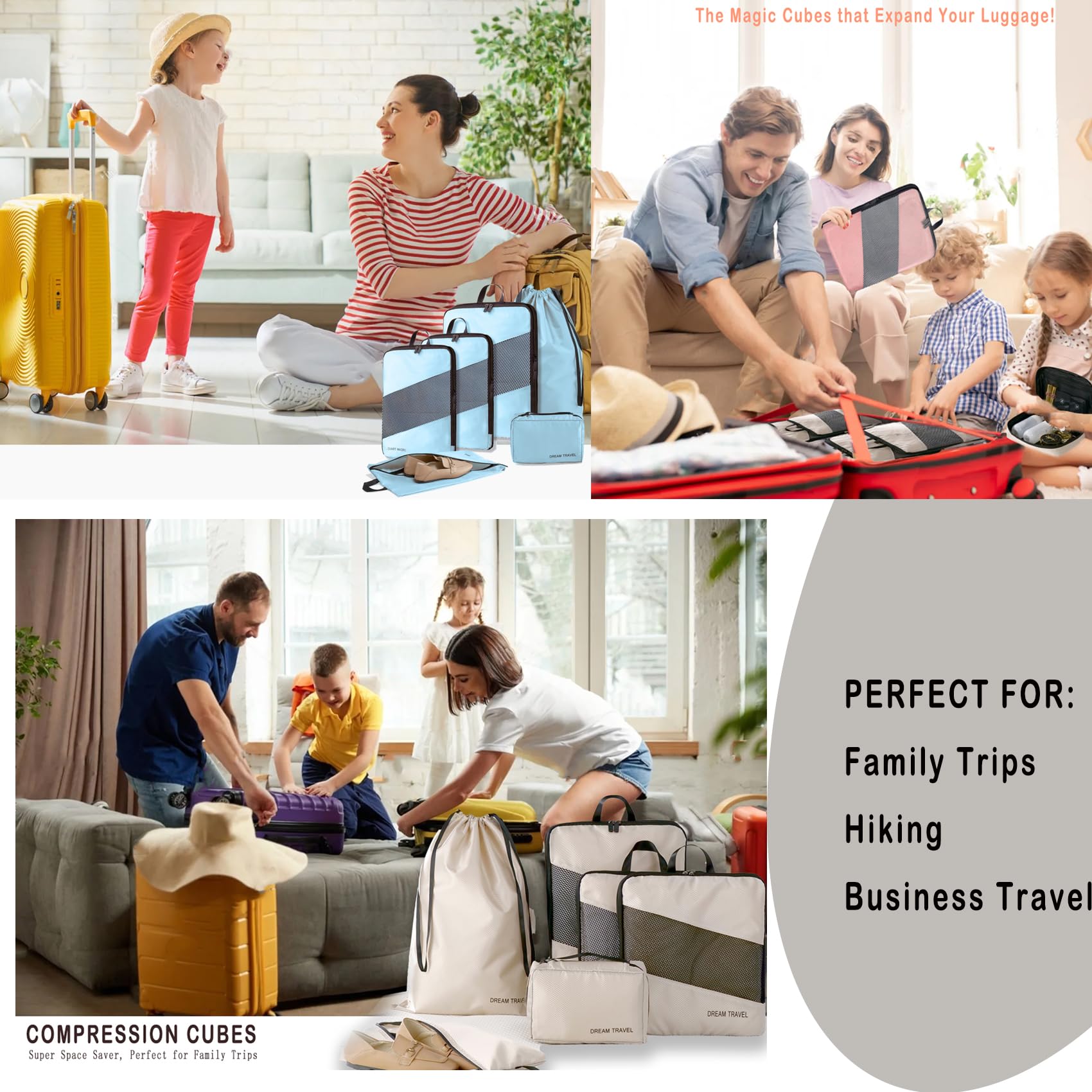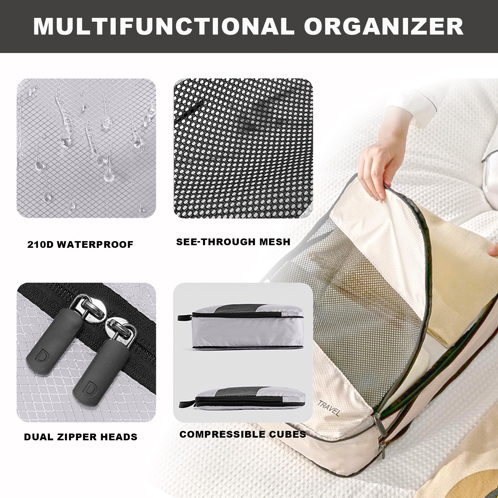 - Versatile & Portable & Multi-Function: The compression packing cubes could be carrying an airline carry-on suitcase, duffle bag, backpack, or tote, these packing bags are sure to fit compactly without taking up a lot of space. You can take these travel cubes for packing on business trips, camping adventures, and vacations, to keep your clothes, toiletries, and other accessories separated, or also use them at home as storage organizers for your cabinets to keep your closet spick-and-span.