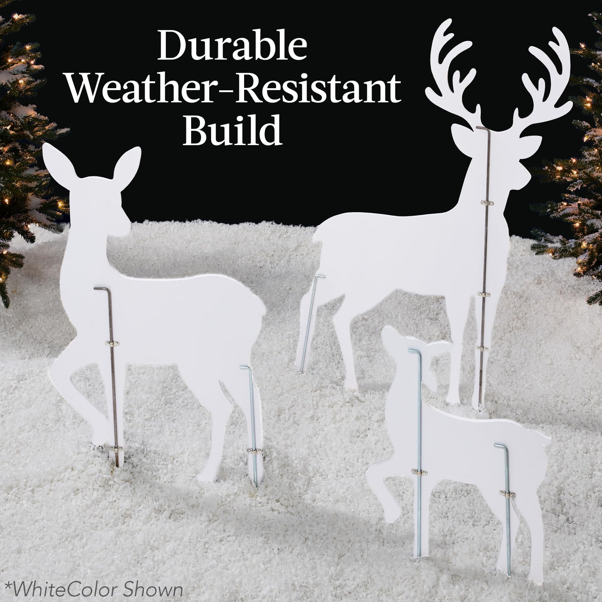 - 2-DIMENSIONAL 3PC DEER FAMILY: Elevate your holidays with a set of stately, flat silhouettes affixed to six solid steel ground stakes for easy placement. Add other PVC items to build out your Holiday scene.