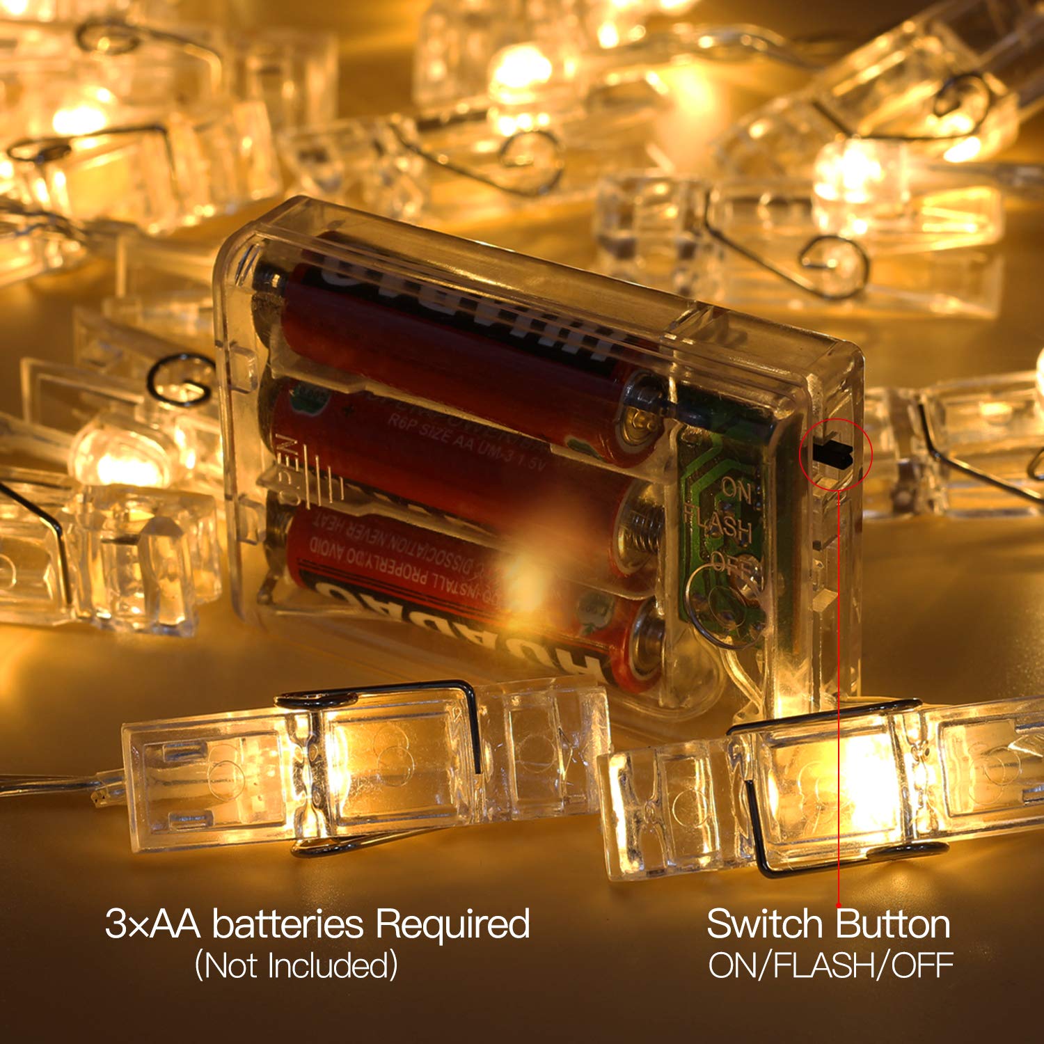 - Battery powered & 2 light modes - Each set is powered by 3 aa batteries (not included), which makes it very safe in your house. Two light modes (always-on/twinkle) allow you to have more options to light up the atmosphere you enjoy. 20 led photo clips, total length is 10 feet. Clips are spaced 6 inches apart, enough space for your most photos and pictures.