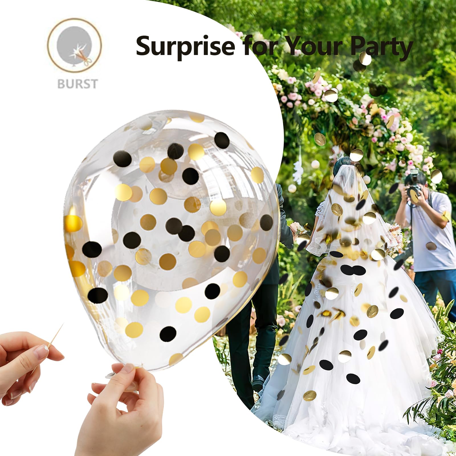 - 【Multi-Occassion】- Black gold confetti balloons can be used in any themed party or mixed with any color to create a perfect wedding, graduation party, birthday party, and any themed party inside or outside, which makes your party more mysterious and special.