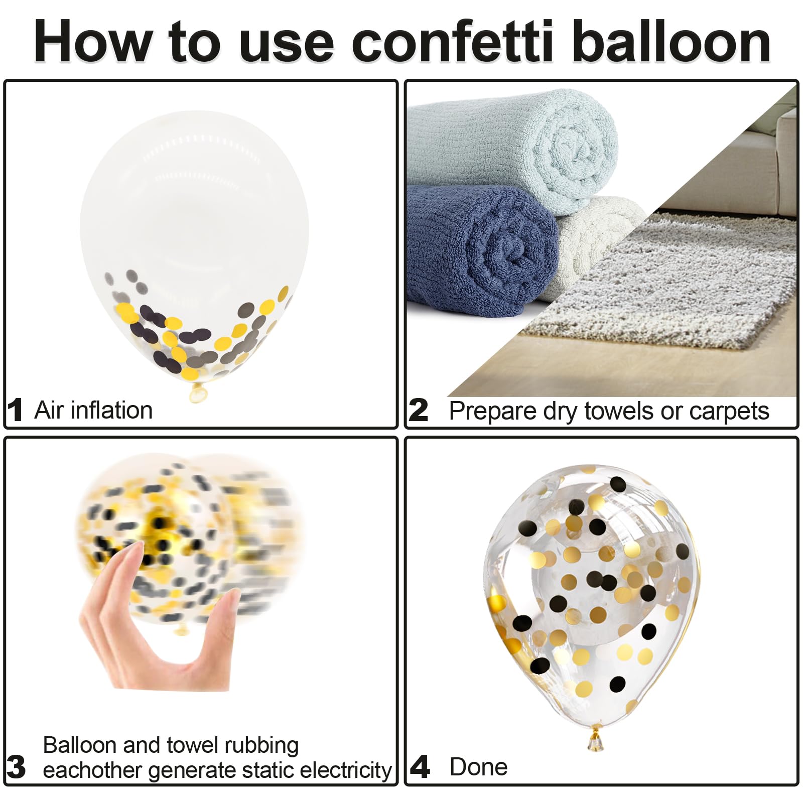 - 【How to Make Black Gold Confetti Balloon】- These black gold confetti latex balloons can inflate hydrogen, helium ( it will float for more than 12 hours), and air.The best way to rub the surface of the balloons is with a dry towel or hair and silk. And it is recommended to use a pump to quickly inflate so that confetti is easier to be stuck.
