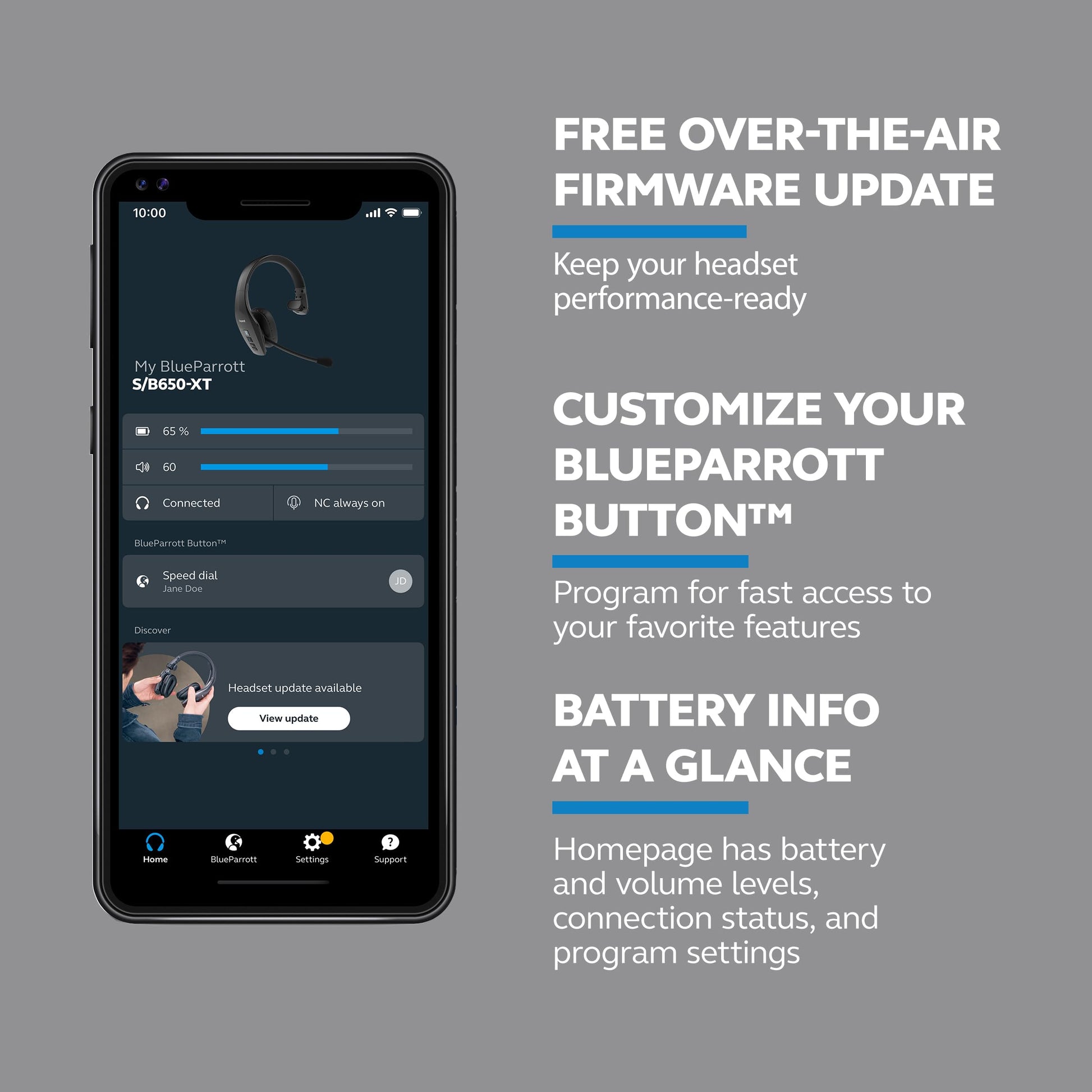 Details: Our BlueParrott S650-XT convertible Bluetooth headset for cell phone provides incredibly clear calls in high-noise environments making it the perfect solution for truck drivers, delivery drivers, farmers, landscapers, and RV drivers who need reliable communication on the go. Featuring powerful 96% noise cancellation, our wireless headset for work includes a second earcup that instantly converts your mono headset into a pair of outstanding stereo headphones with Active Noise Cancellation (ANC). Whether you're driving long hauls, making deliveries, working the farm, or cruising in your RV, our 2-in-1 wireless headset offers up to 36 hours of talk time on a single charge, so you can stay connected all day - from the road to the job site, to winding down with music or a movie, and still have power left for tomorrow. With an impressive 300-foot (100-meter) wireless range, you can leave your phone in the vehicle and still have full access to your calls, making it perfect for long-distance drivers and those who are always on the move. Its IP54-rated protection against dust and water ensures that the S650-XT can handle the rugged demands of trucking, deliveries, landscaping, farming, or RV living. Our noise cancelling headset for delivery drivers allows you to mute calls, speed dial a preferred contact, or Push-to-Talk with your coworkers using the customizable BlueParrott Button. Simply program it with your most-used function for instant access without taking your eyes off the road. In addition, the hear-through headphones lets you use your voice to control calls, GPS directions, music, voice assistants, and more. Our trucker Bluetooth headset pairs up to 7 devices and connects with 2 devices simultaneously, and provides 90 hours of standby time.