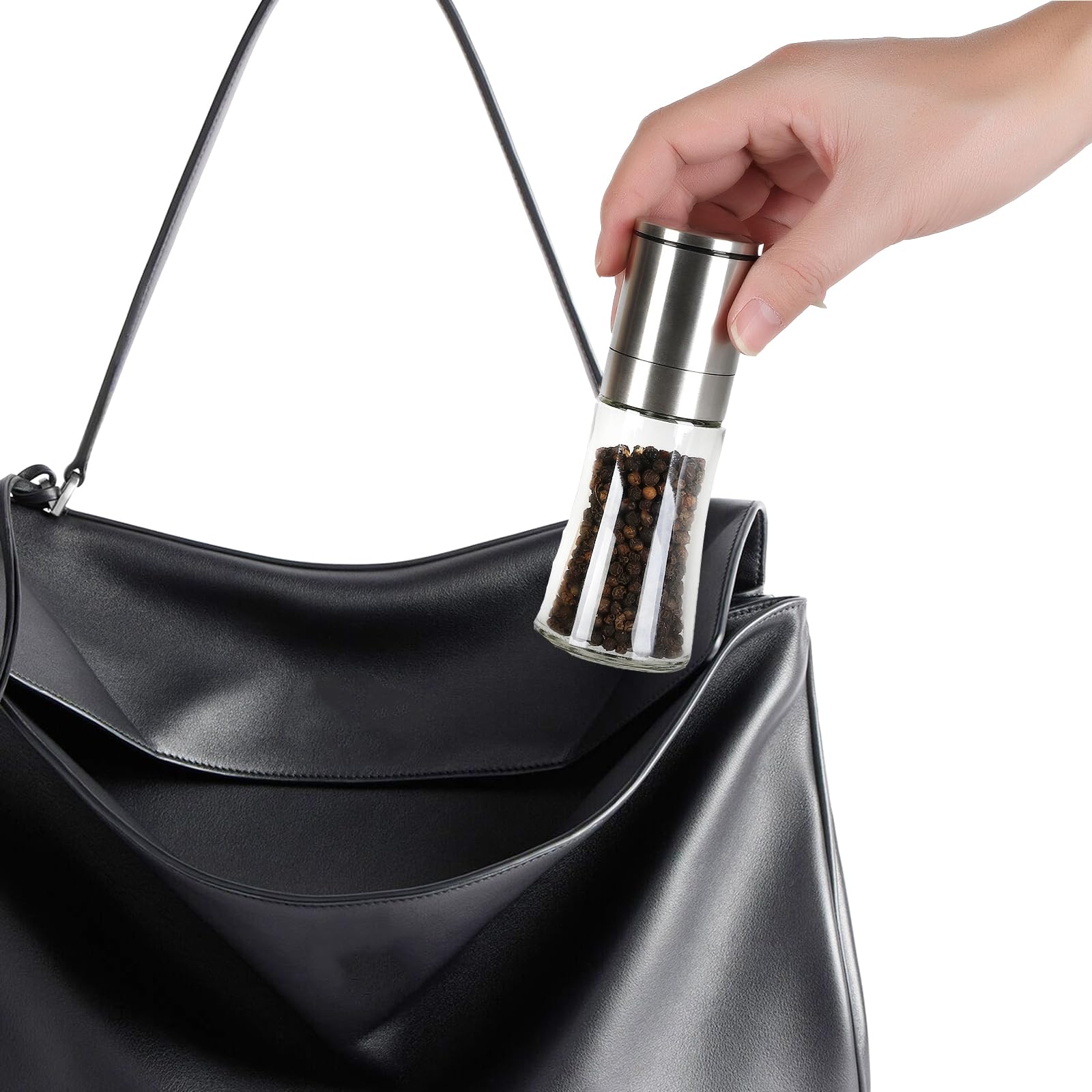 - ✔️Portable Size - This Refillable Salt Grinder or Pepper Grinder is 5.3' tall and 1.95' wide. This is a perfect size - not too big nor too small - easy to store in your lunch bag. This gorgeous salt pepper grinder is not just a stylish kitchen décor item, but also practical gadget for outside dinner, lunch at work, tourism, etc.