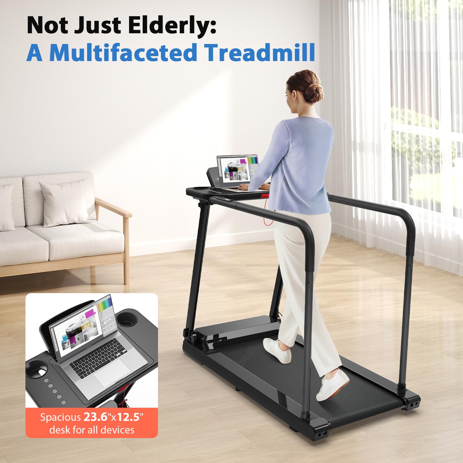 - 【Powerful, Functional & Entertaining】This treadmill for seniors walking with rails has a 2.25 HP motor, supports 350 lbs, and speed from 0.5 - 7.0 mph. It includes a desk for items like glasses, devices, or snacks; a cup holder for drinks; a phone holder for a mobile phone or iPad; and a Bluetooth Speaker for better workout vibes, making exercise more fun and engaging.