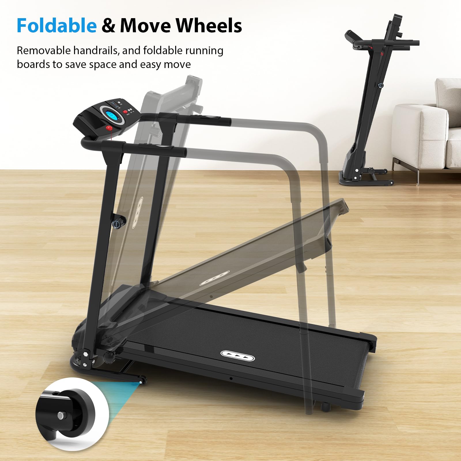 - 【Foldable & Move Wheels】The running board of this foldable treadmill can be lifted and its handrails removed, substantially cutting down on the space it occupies when idle. And the folding process is easy, not need to use many tools or other people to assist. In addition, the walking treadmill is equipped with front-end wheels so that even elderly people alone can move the treadmill to any desired position.
