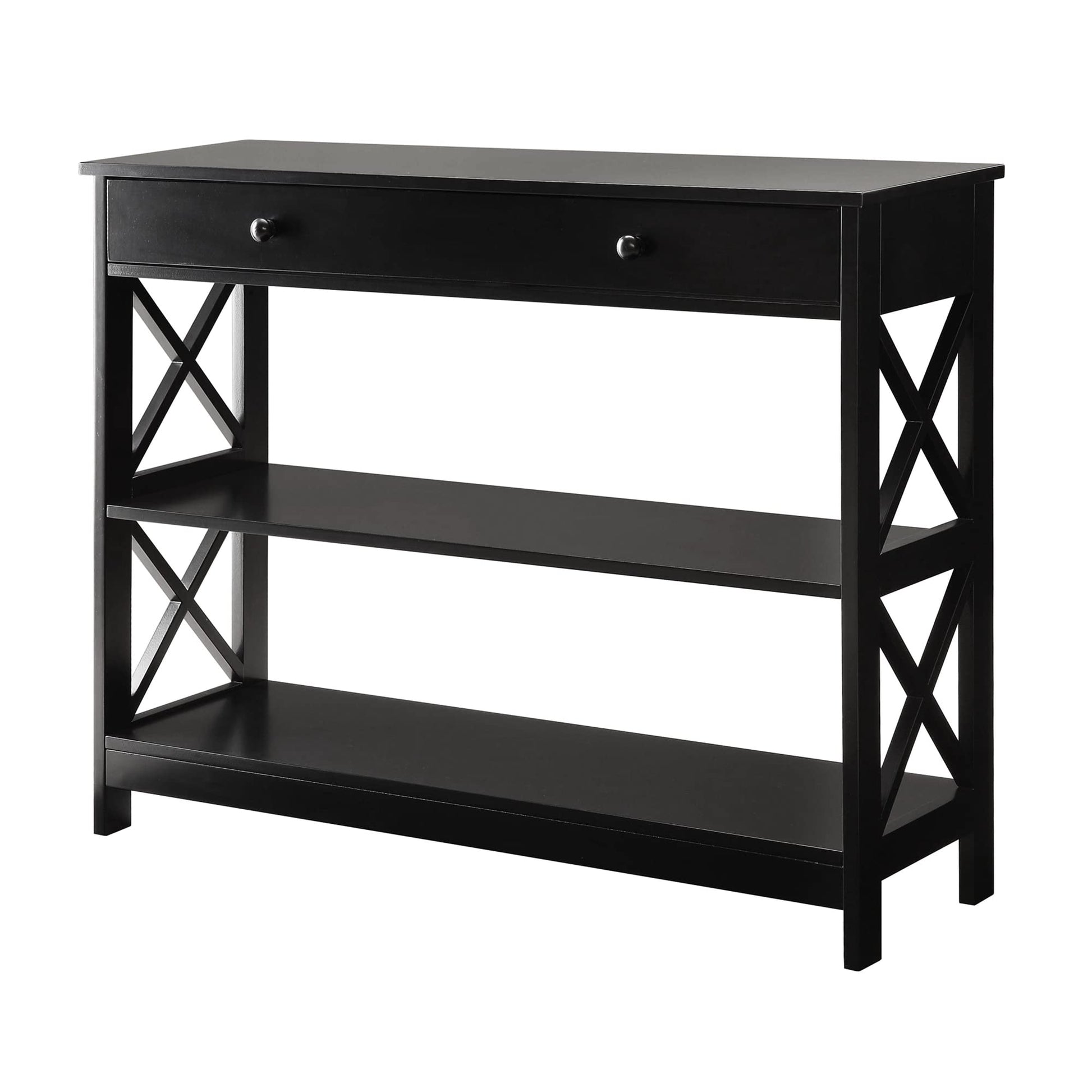 Details: Give your home a handsome makeover with the Oxford 1 Drawer Console Table with Shelves. Featuring a bottom and middle shelf as well as a drawer for concealed storage you can display collectibles and hide away unsightly accessories. The X pattern creates a modern appeal with clean lines. Crafted to last the Oxford 1 Drawer Console Table with Shelves will quickly become a staple in your home. Also available in multiple finishes it will easily complement any decor. Look for other items from the Oxford Collection for the complete look sold separately.