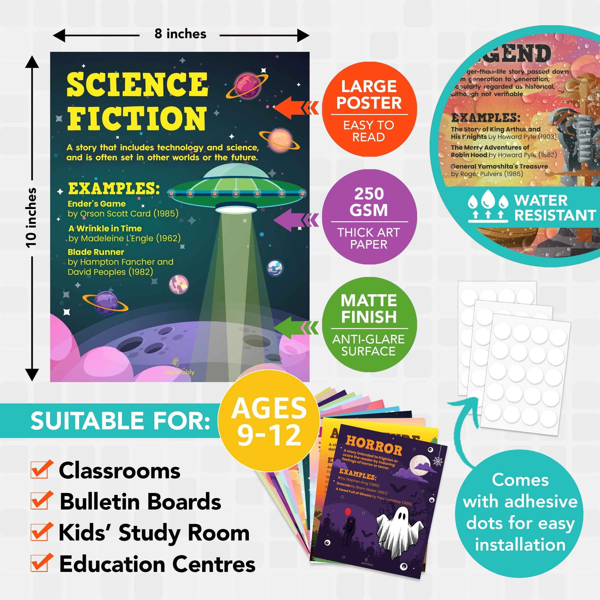 - ENCOURAGE KIDS TO READ - Ignite kids' interest with 24 reading posters for classroom middle school. Featuring vibrant representations of literary genres, these literary genre posters for classroom help kids explore diverse reading materials.