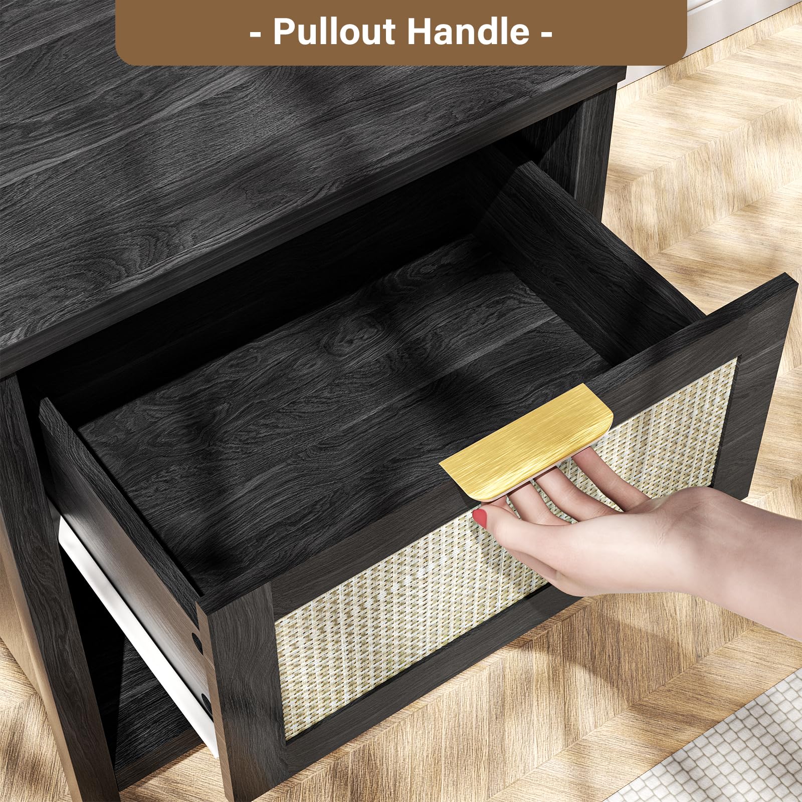 DEMEGA Rattan Nightstand Set of 2 Black Night Stand Bedside Table with Drawer and Storage Shelf Boho Side Table for Bedroom End Tables
