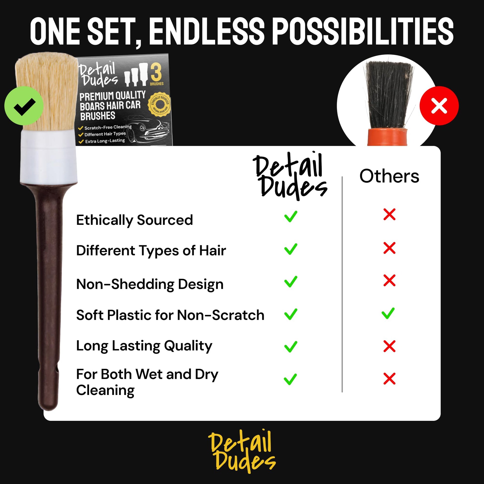 - Premium Car Detailing: The Detail Dudes Soft Boars Hair Car Detailing Brush Set offers unparalleled cleaning precision with ultra-soft bristles that safeguard your vehicle's finish. This car detailing brush kit is essential for enthusiasts who demand a flawless shine