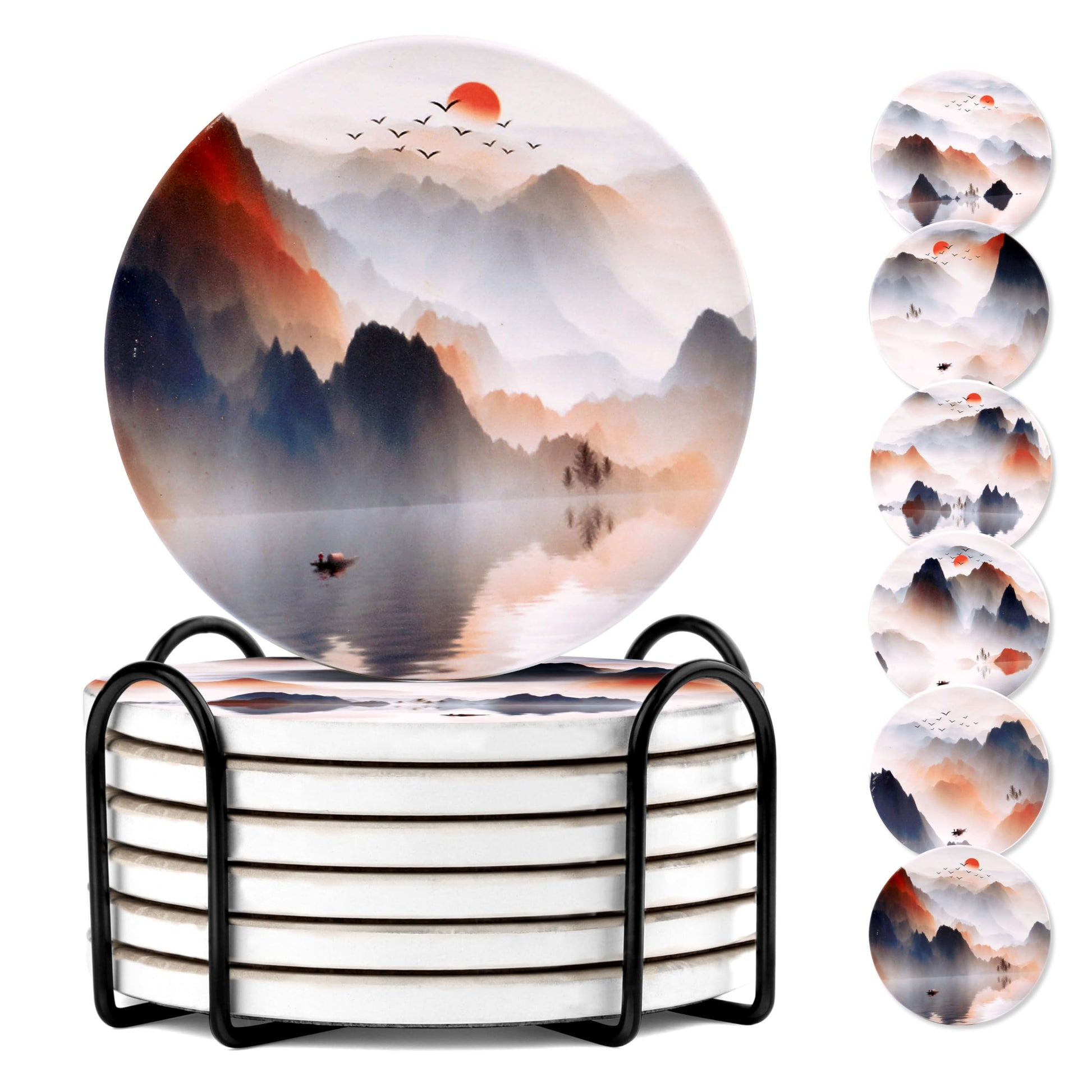 【6 Pcs Drink Coasters】 A set includes 6 pcs round ceramic marble coasters (4 inch) and a 4.5-inch black metal coaster holder. AmyFei Absorbent Drink Coasters have total of 24 different patterns to mee