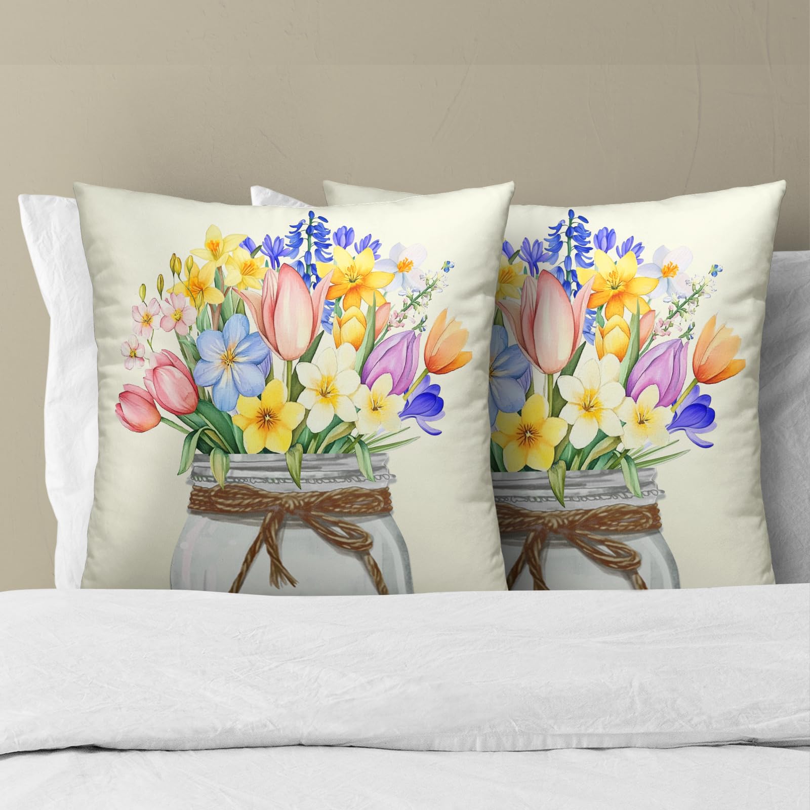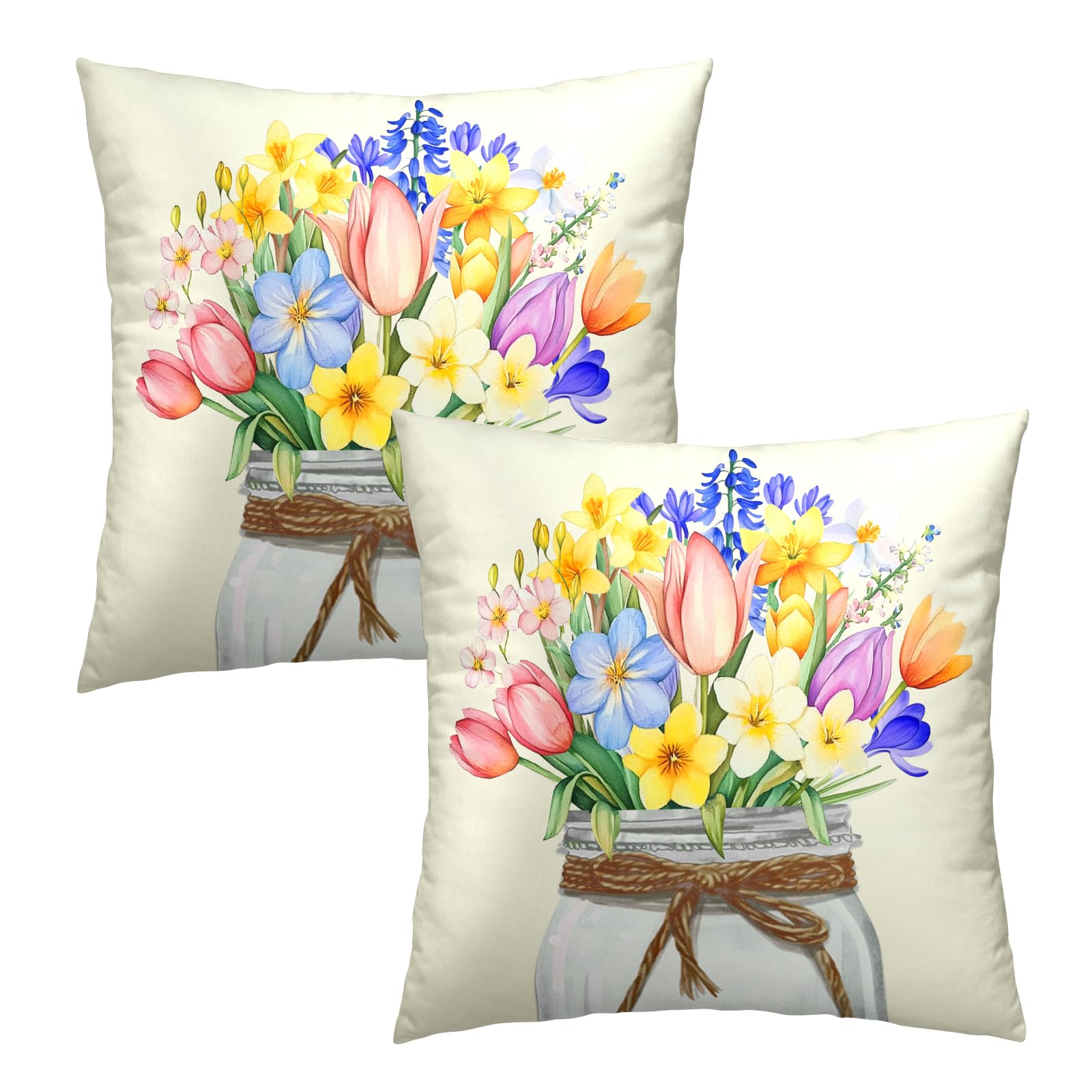 Easter Flowers Throw Pillow Covers 18x18 Set of 2, Spring Tulip Lavender Floral Mason Jar Square Pillowcases Cotton Cushion Cover Decoration for Couch Sofa Living Room Bedroom Home