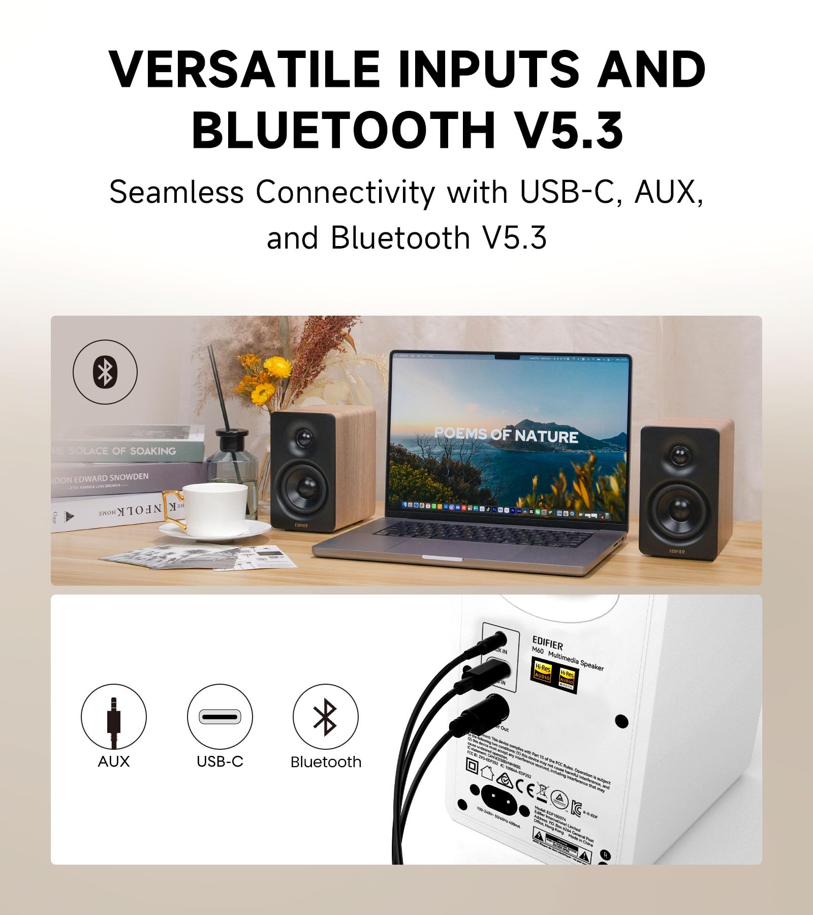 - [Multiple Inputs] The M60 offers versatile connectivity with Bluetooth V5.3 for wireless streaming, and both USB-C and AUX inputs for wired connections