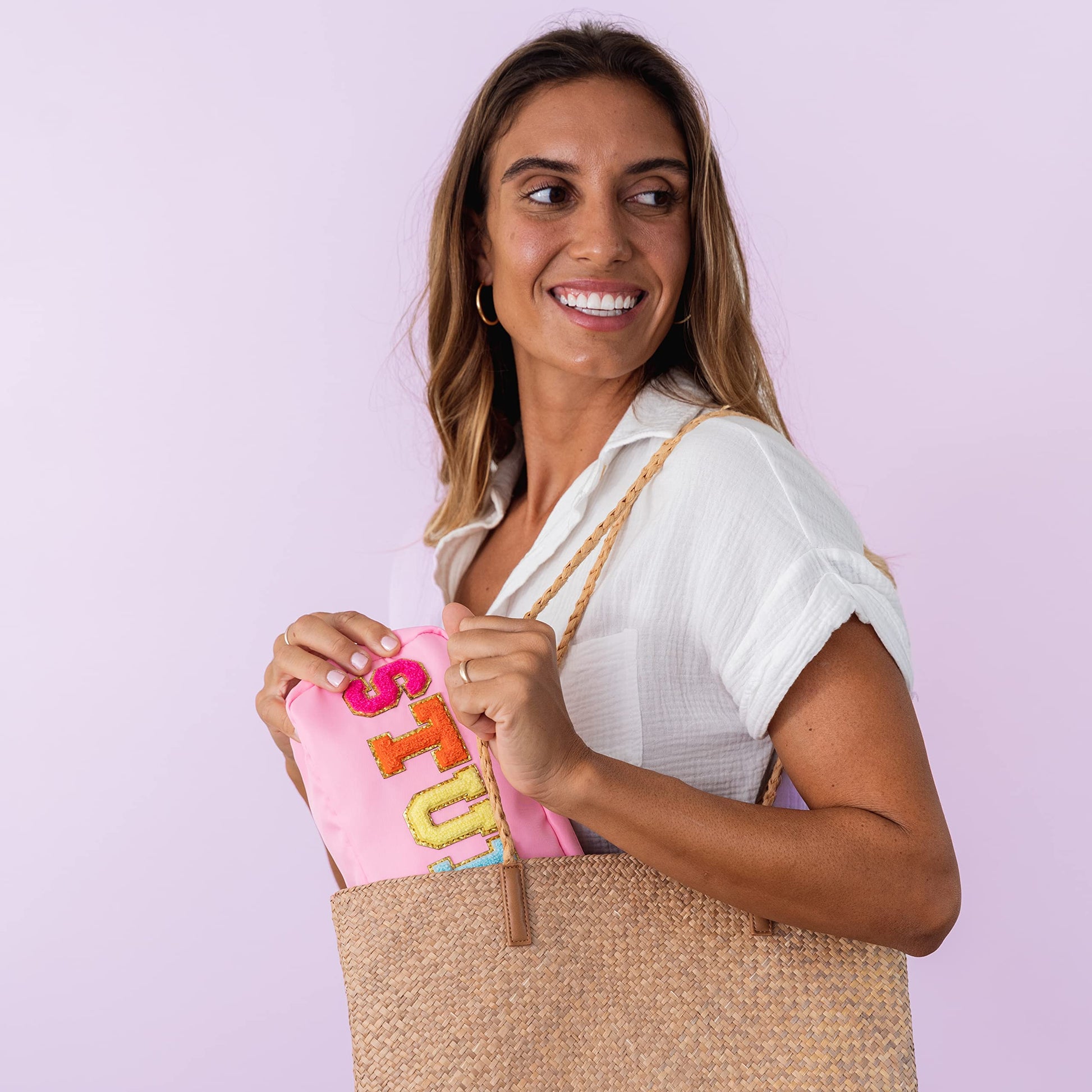 Fablinks Preppy Stuff Bag, Chenille Varsity Letter Makeup Pouch, Pink Nylon Skin Care Zipper Patch Bags Organizer for Women, Travel Make Up Skincare Cosmetic Stocking Stuffers