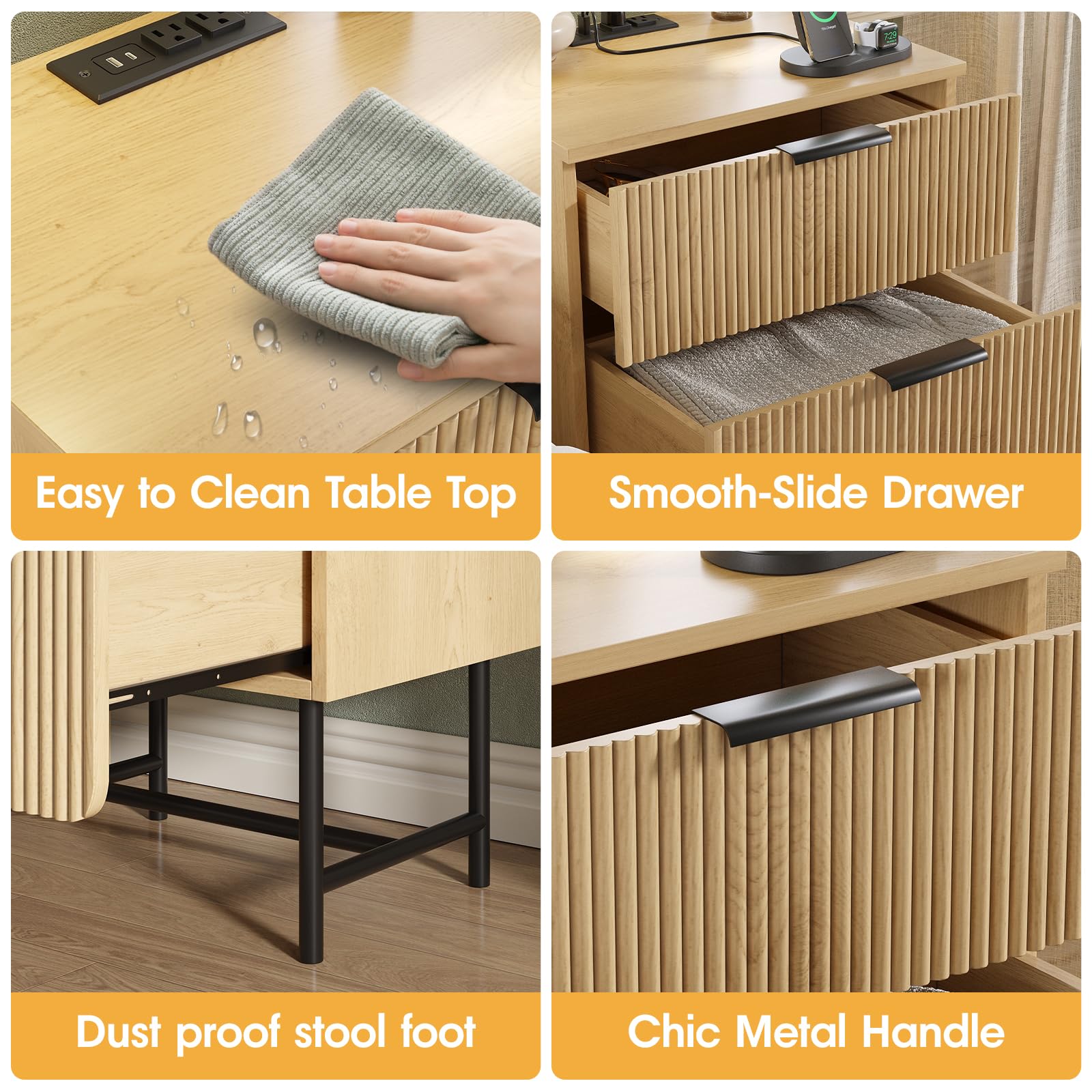 Fluted Nightstand with Charging Station, 20" Modern Bedside Table with 2 Drawers for Bedroom, Mid Century Modern End Table with Storage for Living Room, Natural Oak (1 Piece)