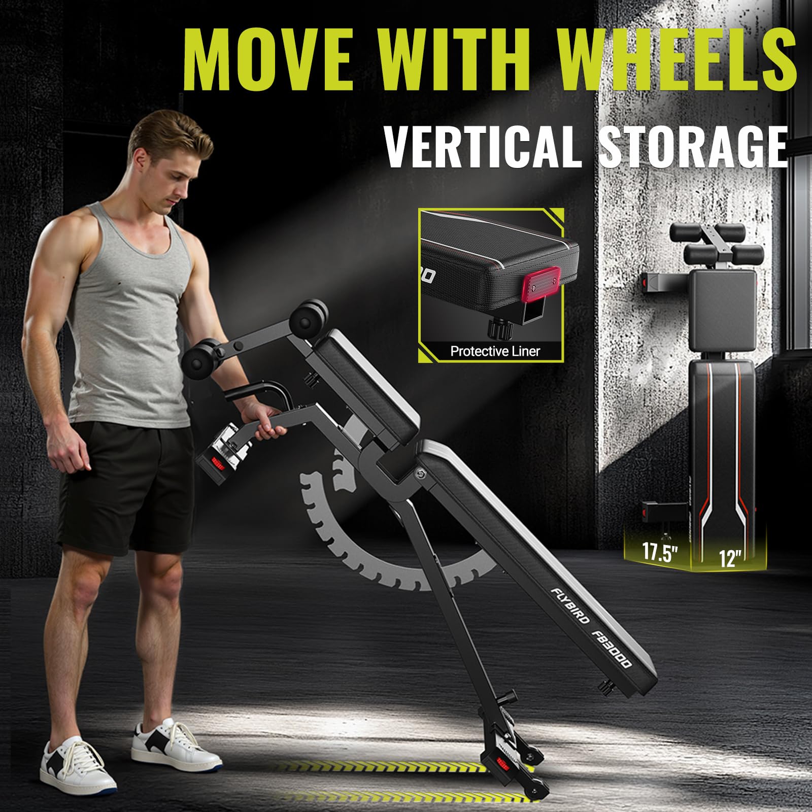 - Vertical Storage & Move with Wheels: Flybird adjustable weight bench allows upright storage to save space to the greatest extent; Equipped with wheels and a handle for effortless mobility; Protective liner on the back pad prevents cushion wear