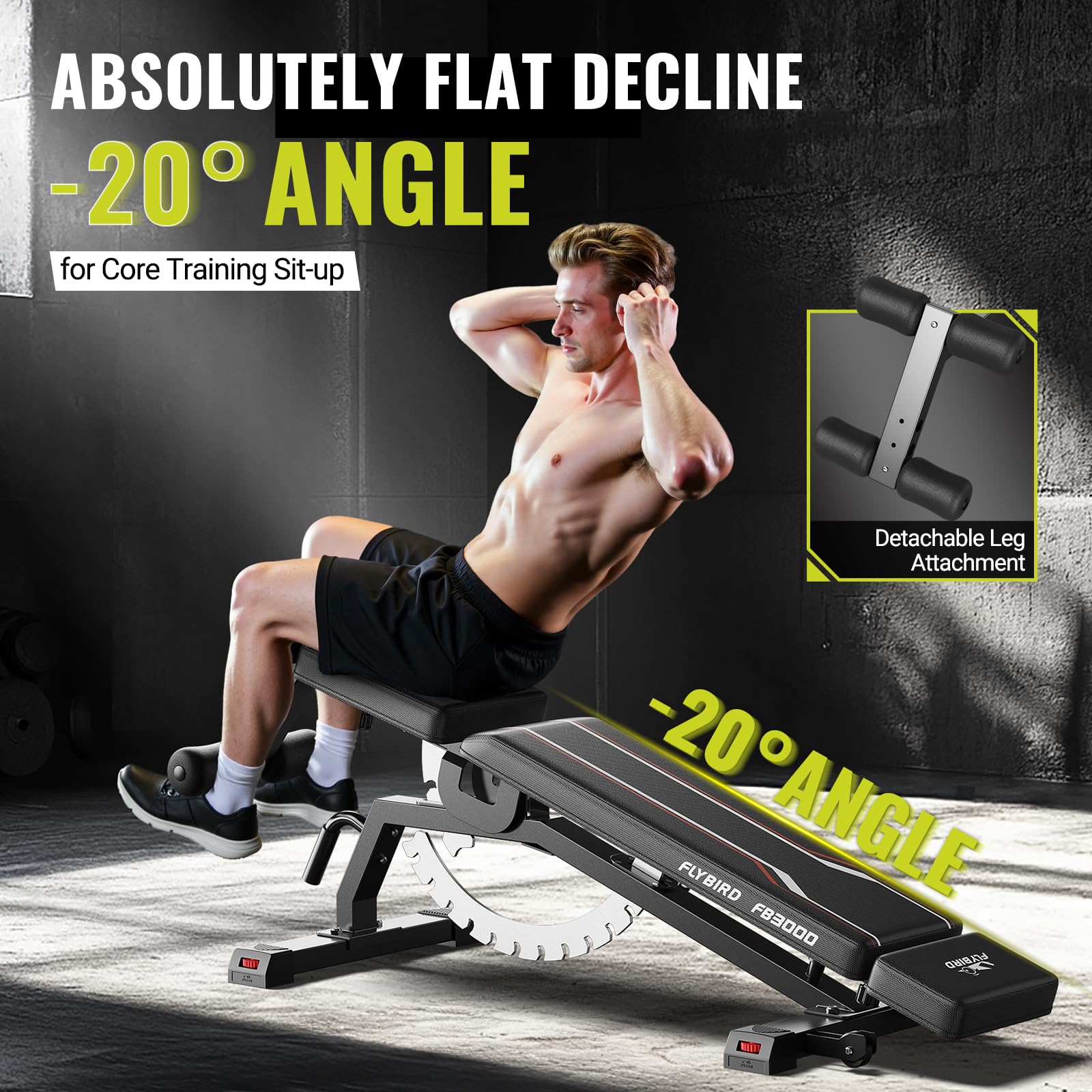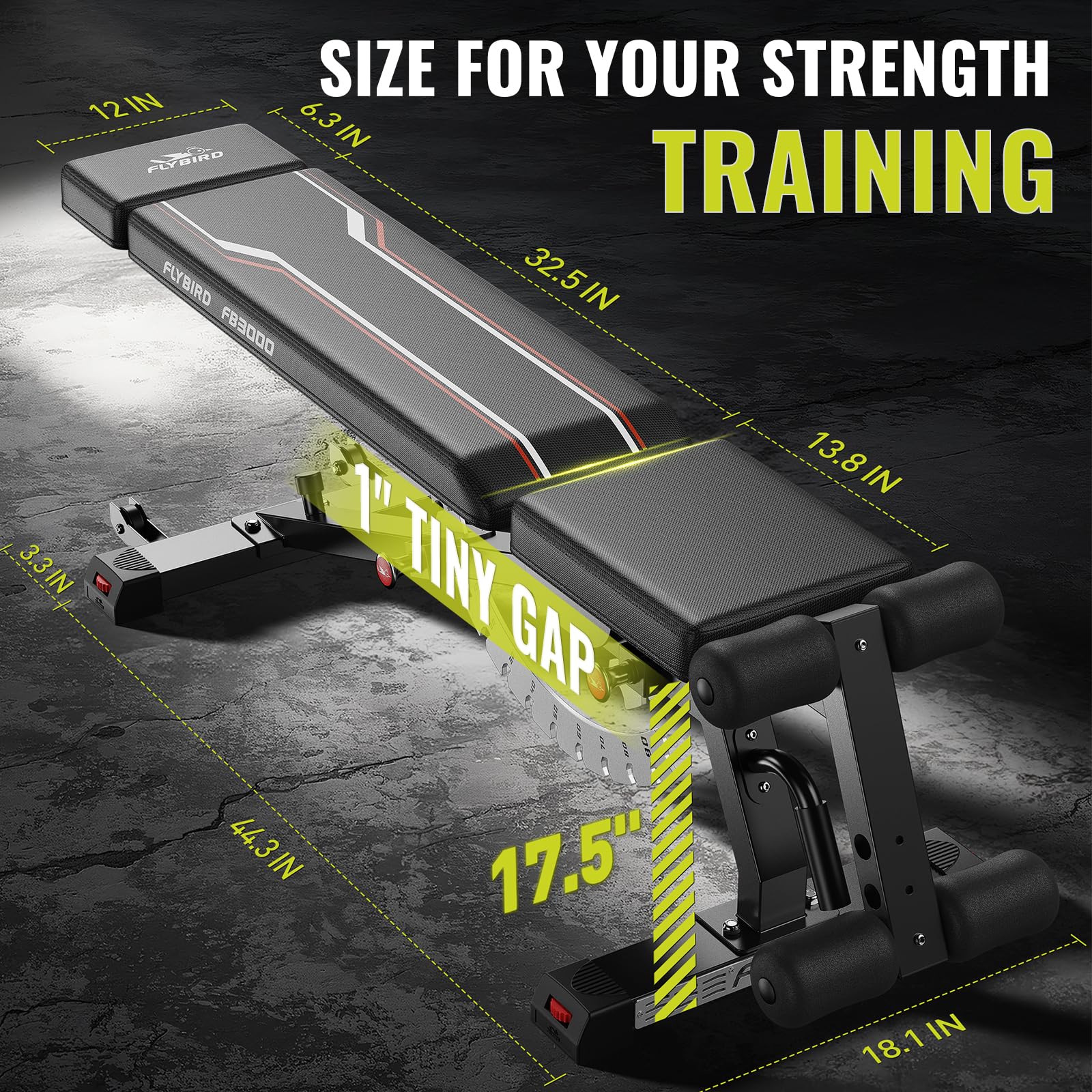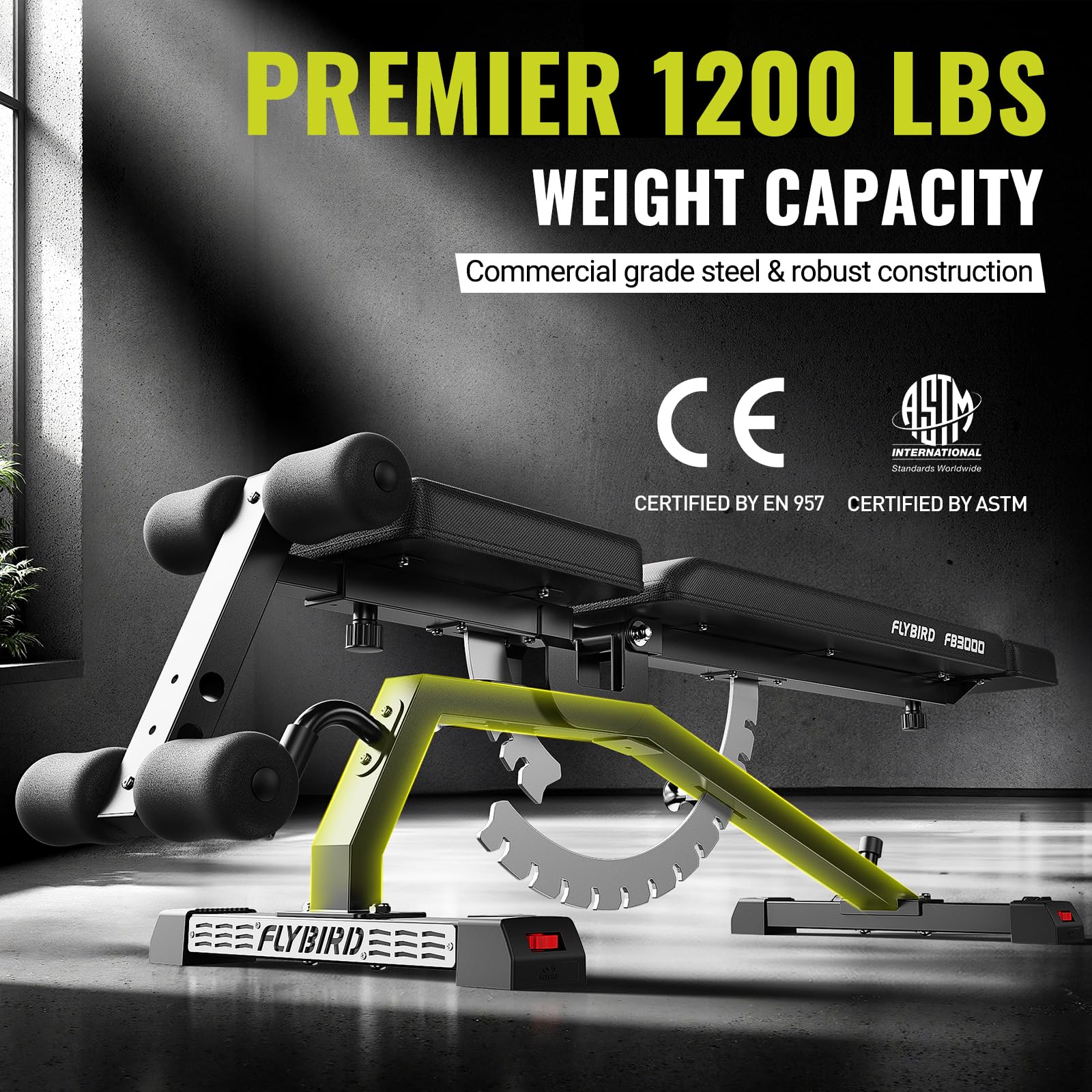 - 1200 LBS Weight Capacity: Flybird weight bench is made of commercial grade steel for a robust construction; 21'' extended base provides a wider, more stable support area; Combines high quality, sturdiness and durability for a reliable workout experience