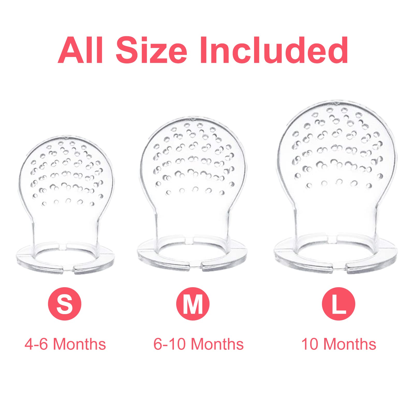 - Baby Fruit Feeder Set (3 pcs feeder+6pcs extra pacifier):The baby food fresh fruit feeder pacifier set with 3 different sizes of silicone teats (S/M/L),S:can be put in fruit & vegetable ;M: pieces of fruit & vegetable ;L:minced meat or fish. the feeders are the gifts during baby weaningand ,baby can chew, suck and taste the whole food goodness, with only small pieces of fruit ,reducing the risk of choking.