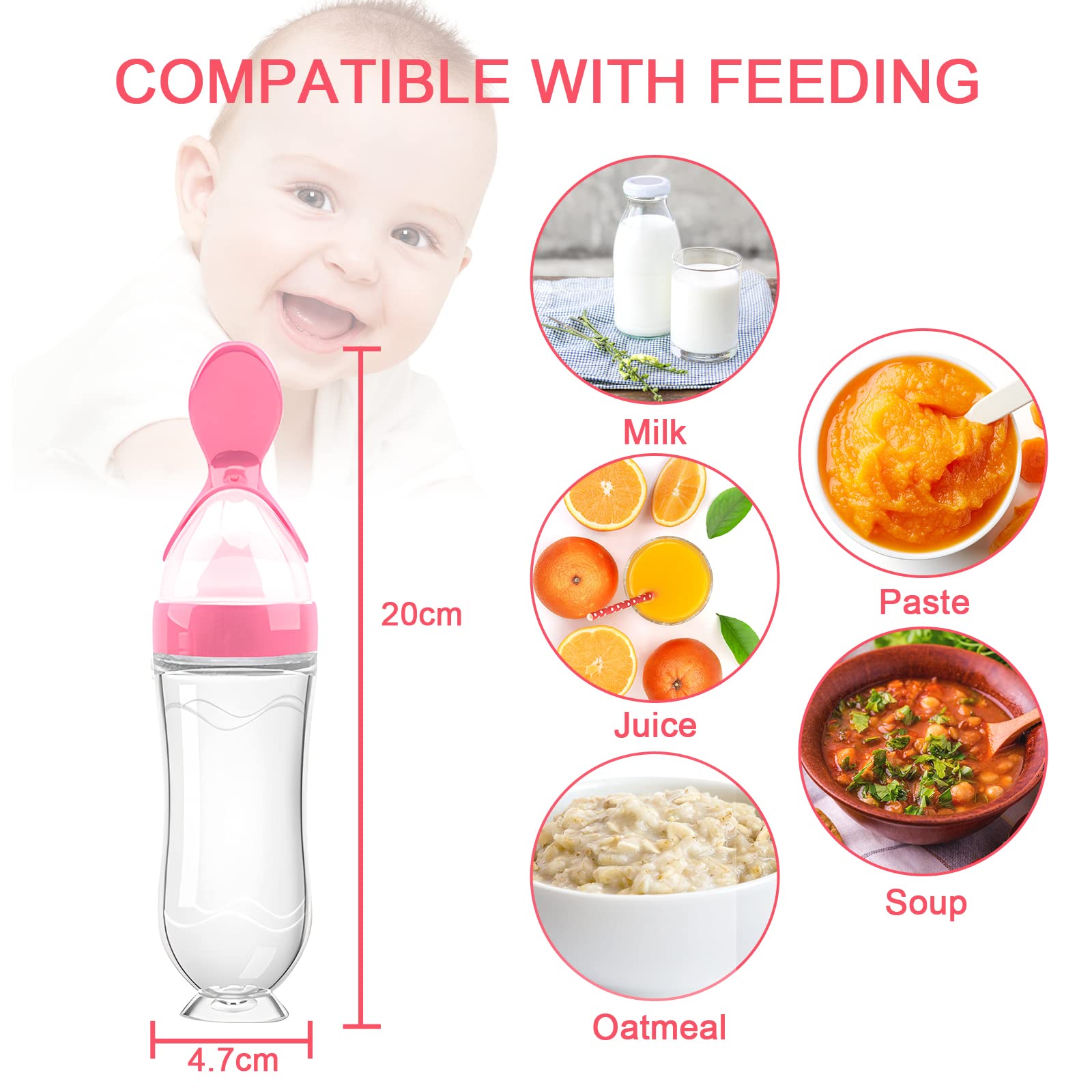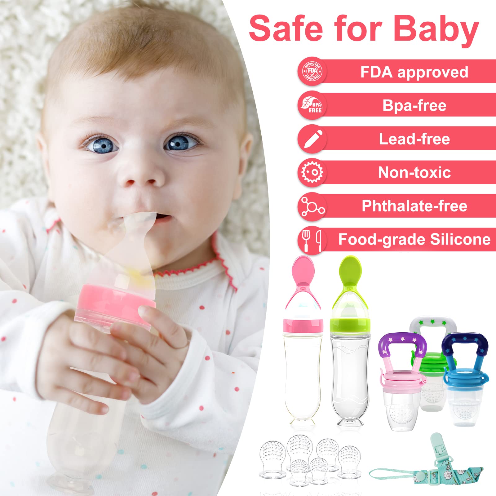 - FEED SAFE&CONVENIENT--The baby food feeder and squeeze spoon feeder are made of food grade silicone, safe and non-toxic. These Silicone nipples more convenient for parents to feed babies, who can chew their food such as fresh and frozen fruits, yoghurt, ice, and breast milk, and absorb nutrients.