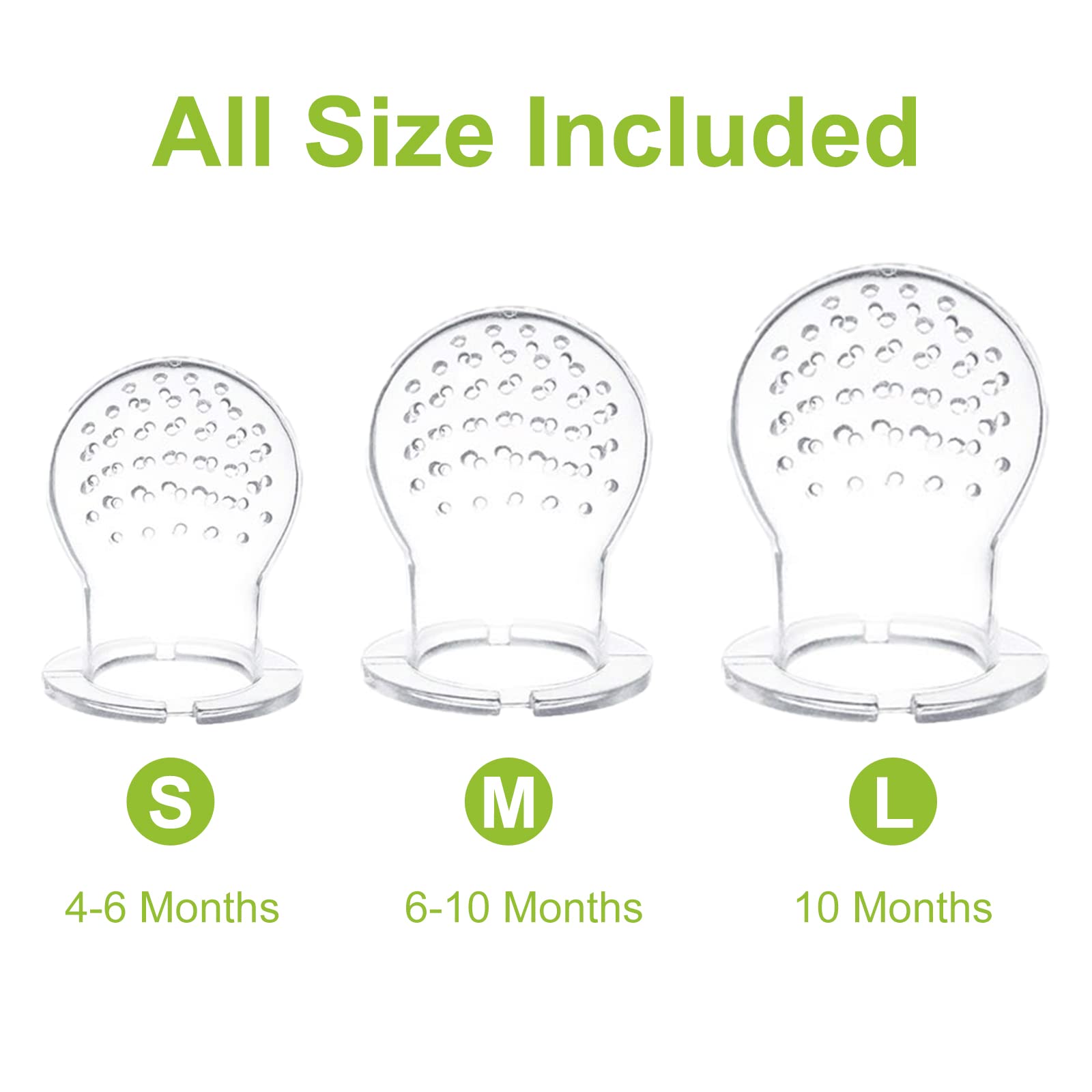- Baby Fruit Feeder Set :The baby food fresh fruit feeder pacifier set with 3 different sizes of silicone teats (S/M/L),S:can be put in fruit & vegetable ;M: pieces of fruit & vegetable ;L:minced meat or fish. the feeders are the gifts during baby weaningand ,baby can chew, suck and taste the whole food goodness, with only small pieces of fruit ,reducing the risk of choking.