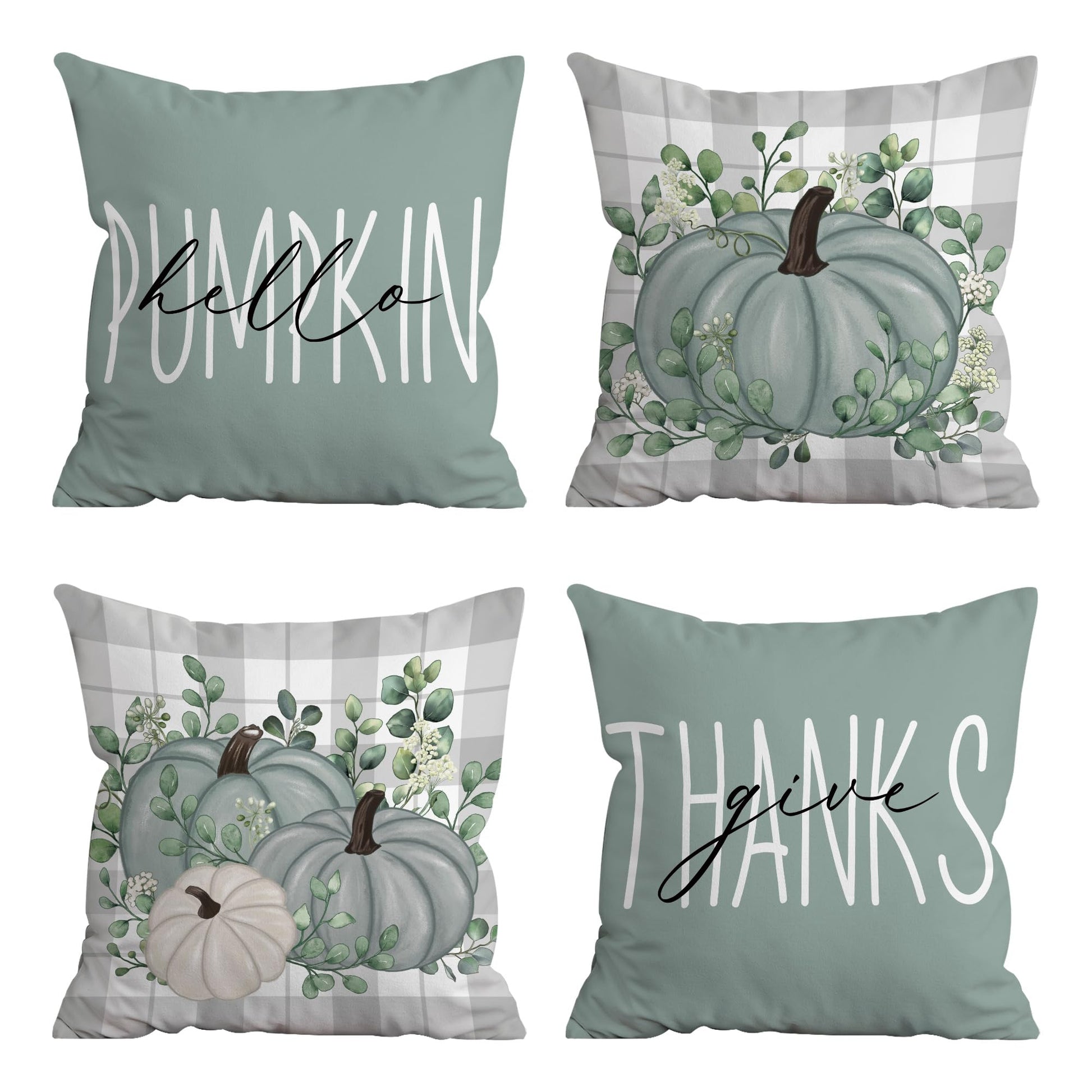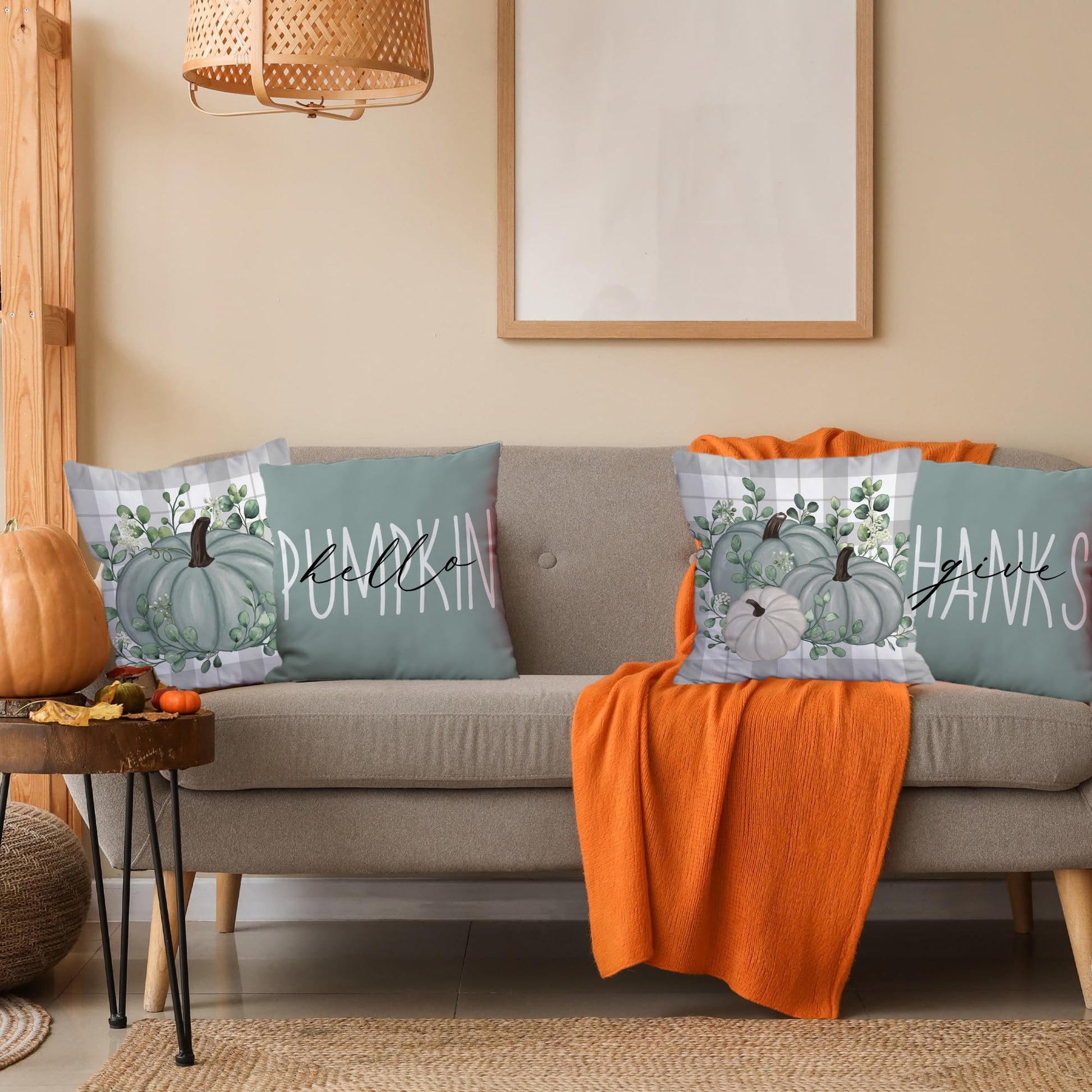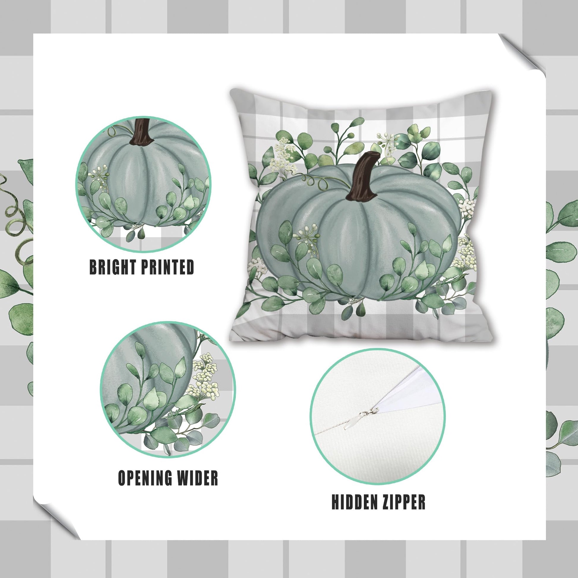 FUTBU Fall Pillow Covers 18x18, Fall Decorations Indoor Pillow Covers Set of 4 Blue, Autumn Decor Pumpkin Eucalyptus Leaves Throw Pillow Covers Harvest for Couch Sofa Living Room Outdoor Thanksgiving